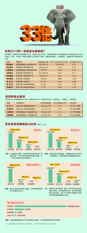 证券时报记者 曾炎鑫 成功押注金融地产股的安邦,去年到底赚了多少钱? 安邦保险集团昨日披露的年报显示,安邦保险寿险和财险去年合计实现净利259.49亿元,同比增长了5.87倍,其中安邦人寿增速迅猛,一年内净利暴增了33倍。 这个盈利规模有多高?对比中国太保和新华保险的净利润可知,两公司净利润分别为112.45亿元和64.07亿元,安邦已远超两者净利润之和。 作为“资产驱动负债”模式的代表,投资收益的爆发增长是安邦去年业绩搭上“直升机”的重要原因。数据显示,安邦寿险和安邦财险去年分别实现了136.87亿元和225.98亿元投资收益,同比分别增长了19.86倍和2.74倍。 值得一提的是,在和谐健康险的年报中,安邦保险将民生银行和金融街列为进行长期股权投资的“联营企业”,从而采取了权益法核算。这意味着,民生银行和金融街对公司的利润影响,不再取决于二级市场上的价格波动,而取决于其应享有的净损益份额。 净利超太保和新华 安邦保险集团昨日披露了旗下寿险、财险、健康险和养老险4家公司年报。年报显示,尽管一直被业内人士称之为“黑马”、“新秀”和“野蛮人”,但在业绩上安邦保险已经具备问鼎第一梯队保险公司的资格。 在安邦保险的集团架构中,安邦财险和安邦人寿是重要控股链条,两家公司分别控股了和谐健康险和安邦养老,同时也在年报中合并了多家子公司的业绩。 数据显示,安邦财险和寿险去年共实现营业收入970.38亿元,同比增长近4倍,同时实现净利润合计259.49亿元,同比增长5.87倍。其中,投资收益是营业收入的重要增长力量,两家公司去年共实现投资收益362.85亿元,同比增长4.43倍。 具体而言,安邦人寿去年实现营业收入671.96亿元,同比增长24.36倍,实现净利润84.83亿元,同比增长33倍;安邦财险实现营业收入298.42亿元,同比增长78.01%,获得净利润174.65亿元,同比增长3.95倍。相较之下,安邦财险已超越了以财险见长的中国太保去年112.45亿元净利润水平,安邦人寿也超越了新华保险去年64.07亿元的净利润规模。 此外,和谐健康险去年实现了营业收入49.24亿元,同比增长2.7倍,获得净利润33.77亿元,同比增长36.44倍。即便是只成立了一年的安邦养老也实现盈利,共获得营业收入约1亿元,实现净利润0.43亿元。 偿付能力方面,由于安邦保险集团近两年频繁安排旗下子公司进行增资,4家险企都显得资本实力有些“超常规配置”。 数据显示,截至去年年底,安邦人寿的偿付能力充足率为678.44%,和谐健康险也拥有702%的偿付能力充足率,而更夸张的是,安邦财险拥有5152%的偿付能力充足率,而业务刚起步的安邦养老的偿付能力充足率甚至达到了8320393.84%。相较之下,保监会对险企偿付能力的标准要求只是150%。 对于安邦保险集团的超高偿付能力现象,一家总部在南方的保险公司高管表示,可能是安邦保险管理层认为未来会有爆发性的保费收入增长,也可能是后续还有更大的投资运作计划。 强投资、弱保费 在押中去年下半年的金融地产股行情后,安邦保险的投资实力逐渐被市场和投资者认可,乃至出现了“安邦概念股”,投资收益也成为安邦保险的最重要驱动力。不过,相对投资收益的突飞猛进,安邦保险呈现明显的强投资弱保费特征。 这种特征在安邦财险和和谐健康险上体现得最为明显。作为安邦保险集团的老本业,安邦财险是安邦保险集团的利润来源大头,同时也是安邦保险的重要投资平台。在安邦财险298.42亿元的营业收入中,保险业务收入只贡献了53.14亿元,占比不足18%,保险业务收入同比也只增长了5.91%。 在现金流量表中,上述现象呈现得更为明显。数据显示,安邦财险去年的经营现金流同比下降了79.86%,达87.49亿元,一方面是由于经营现金流出增加了19%,另一方面则是由于经营活动现金流入大幅减少,特别是保户储金及投资款净增加额同比下降了80.54%,去年仅增加72.57亿元。 和谐健康险也有类似情况。在和谐健康险去年49.24亿元的营业收入中,保险业务收入也仅贡献了1.59亿元,同比只增加了20.64%,43.12亿元的投资收益占据绝对大头。在现金流方面,和谐健康险去年的经营现金流也出现了大幅下降,但投资现金流和筹资现金流都出现了大幅增长。 相较之下,安邦人寿实现了投资收益和保险业务的双高速增长,去年实现保险业务收入528.88亿元和投资收益136.87亿元,两者分别同比增长37.66倍和19.86倍。 值得留意的是,安邦人寿在保费高速增长的同时,保费来源高度依赖银行渠道,99.97%的保费收入来自银行代理渠道。随着保费的快速增长,安邦人寿支付给银保渠道的手续费也同步暴增,去年共计支付了16.33亿元手续费给银保渠道,同比增长了38.12倍。 安邦人寿表示,公司在综合权衡了成本与效益、稳定与发展的关系后,计划未来3年继续以发展银保渠道为主,通过开设新机构和获取更多银行代理网点将新业务规模保费维持在合理区间,降低流动性风险。 民生银行、金融街 被列为联营企业 投资收益暴增是安邦保险业绩搭上“直升机”的最重要原因之一,安邦保险如何实现这些巨额的投资收益? 在会计科目上,安邦人寿和安邦财险出现了不同的实现路径,前者主要通过被列为长期股权投资的联营企业实现,后者则主要表现为“公允价值计量转权益法核算确认的当期收益”。 数据显示,安邦人寿的136.87亿元投资收益中,有60%是来自联营企业。根据财报附注,对于被列为长期股权投资