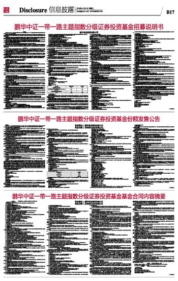 [重要提示] 1、鹏华中证一带一路主题指数分级证券投资基金(以下简称“本基金”)的募集及其基金份额的发售已获中国证监会证监许可2015[769]号文注册。中国证监会对本基金的注册并不代表中国证监会对本基金的风险和收益做出实质性判断、推荐或者保证。 2、本基金是契约型开放式,股票型证券投资基金。 3、本基金管理人为鹏华基金管理有限公司(以下简称“本公司”),基金托管人为招商银行股份有限公司(以下简称“招商银行”),登记机构为中国证券登记结算有限责任公司。 4、本基金自2015年5月8日起至2015年5月22日止,通过深圳证券交易所挂牌发售,同时通过基金管理人指定的场外销售机构(包括直销中心和其他销售机构)发售,基金管理人可根据募集情况适当延长或缩短本基金的募集期限并及时公告。 5、投资者可通过场外认购和场内认购两种方式认购本基金。本基金通过场外发售的销售机构包括直销机构和其他销售机构。其中直销机构指本公司设在深圳、北京、上海、武汉和广州的直销中心及本公司的网上交易系统;其他销售机构包括招商银行等;本基金通过场内发售的机构为具有基金销售资格的深圳证券交易所会员单位。 6、本基金募集对象为符合法律法规规定的可投资于证券投资基金的个人投资者、机构投资者及合格境外机构投资者,以及法律法规或中国证监会允许购买证券投资基金的其他投资者。 7、本基金募集期内不设募集上限。 8、投资者欲通过场外认购本基金,需开立中国证券登记结算有限责任公司的开放式基金账户。若已经在中国证券登记结算有限责任公司开立开放式基金账户的,则不需要再次办理开户手续。募集期内本公司直销中心和指定的基金销售代理机构网点同时为投资者办理场外认购的开户和认购手续。 9、投资者欲通过场内认购本基金,应使用深圳A股账户或深圳基金账户。募集期内具有基金销售资格的深交所会员单位可同时为投资者办理场内认购的开户和认购手续。 10、通过本基金指定销售机构场外认购基金,单笔认购的最低金额为1,000元。通过本公司直销中心的首次最低认购金额为50万元,追加认购单笔最低认购金额为1万元,不设级差限制(通过本公司基金网上交易系统认购本基金暂不受此限制)。本基金募集期间对单个基金份额持有人最高累计认购金额不设限制。 11、通过具有基金销售资格的深圳证券交易所会员单位场内认购基金,单笔最低认购份额为50,000份,超过50,000份的应为1,000份的整数倍,且每笔认购最大不超过999,999,000份。本基金募集期间对单个基金份额持有人最高累计认购份额不设限制。 12、本基金募集期间对于单个基金份额持有人不设置最高累计认购金额限制。 13、投资者在募集期内可以多次认购基金份额,但已申请的认购不允许撤销。 14、销售机构对认购申请的受理并不代表该申请一定成功,而仅代表销售机构确实接收到认购申请。认购的确认以基金合同生效后登记机构的确认结果为准。投资者应在基金合同生效并正式发布生效公告后第二日起到原认购网点打印认购成交确认凭证。 15、本公告仅对本基金募集的有关事项和规定予以说明,投资者欲了解本基金的详细情况,请仔细阅读2015年5月5日刊登在《 证券时报 》和本公司指定销售机构网站上的《鹏华中证一带一路主题指数分级证券投资基金招募说明书》。 16、本基金的基金合同、招募说明书及本公告将同时发布在本公司网站(www.phfund.com)。投资者亦可通过本公司网站下载基金申请表格和了解有关基金募集事宜。 17、募集期内,本基金还有可能新增或调整销售机构,请留意近期本公司及各销售机构的公告,或拨打本公司及各销售机构的客户服务电话咨询。 18、对于未开设本基金销售网点地区的投资者,可拨打本公司客户服务电话(400-6788-999;0755-82353668)或基金管理人指定的各销售机构的客户服务电话咨询本基金的认购事宜。 19、基金管理人可综合各种情况对本基金份额的发售安排做适当调整,并予以公告。 20、本发售公告中未明确指明仅适用于“场内认购”或“场外认购”的相关内容,对于“场内认购”、“场外认购”均适用。 21、风险提示 基金管理人提示投资者充分了解基金投资的风险和收益特征,根据自身的风险承受能力,审慎选择适合自己的基金产品。基金管理人依照恪尽职守、诚实信用、谨慎勤勉的原则管理和运用基金财产,但不保证基金一定盈利,也不保证最低收益。本基金属于股票型基金,其预期的风险与收益高于混合型基金、债券型基金与货币市场基金,为证券投资基金中较高风险、较高预期收益的品种。同时本基金为指数基金,通过跟踪标的指数表现,具有与标的指数以及标的指数所代表的公司相似的风险收益特征。从本基金所分拆的两类基金份额来看,带路A份额为稳健收益类份额,具有低风险且预期收益相对较低的特征;带路B份额为积极收益类份额,具有高风险且预期收益相对较高的特征。本基金面临的主要风险有市场风险、管理风险、操作风险、流动性风险、信用风险、本基金特有风险(包括作为指数基金的风险、作为上市基金的风险和作为分级基金的风险)及其他风险等。本基金以1元初始面值发售,但在市场波动等因素的影响下,基金投资仍有可能出现亏损或基金净值仍有可能低于初始面值。基金管