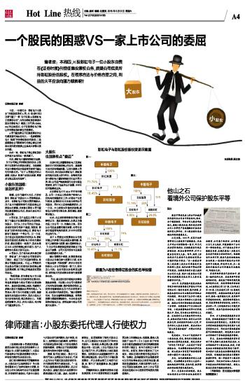 证券时报记者 唐盛 日前,一位署名为“彩虹电子小股东”的港股投资者A君,在《证券时报》自费刊登了一则“公开征集H股彩虹电子投票权公告”,向作为彩虹股份重要大股东的彩虹电子(港股上市代码:00438.HK)的全体股东,公开征集彩虹电子转让所持彩虹股份事宜的投票权。 A君刊登这则公开征集投票权的公告最直接的理由有两点:一是质疑彩虹电子“低卖”所持彩虹股份的股权;二是质疑彩虹公司即将举行的转让事宜分类表决通知是否能够让全体或大多数小股东知悉。 如此一来,彩虹电子转让彩虹股份似乎就不会再那么一帆风顺了。 对此,彩虹电子董秘褚晓航回应称,“关于公司转让所持彩虹股份权益,以及将于近期举行分类表决事宜,均是按照内地与香港两地市场监管的要求刊登公告告知股东的。”对于A君提出的两点质疑,他表示“希望个别股东理解,尊重其它独立股东的选择”。 小股东的困惑: 该怎样发声? 据悉,公告刊登两三天后,已经有数名“彩虹系”的股东与A君取得联系。其中,有彩虹电子的股东更明确表示,自己也不知悉即将举行的股权转让分类表决的事情,并宣称在看到A君刊登的征集投票权公告后,将会在表决当日投反对票。 A君坦言,自己也是迫不得已才采取了刊登公开征集投票权公告这招棋。他表示,自己从上市公司的公开信息、券商研究报告等多个渠道,预期到“彩虹系”历经本次权益转让后,彩虹电子极有可能变成一个壳公司;另一方面,自己通过对这些资讯的研究认为,彩虹股份的股权仍是彩虹电子持有的最有价值、最有前景的一块资产,因此如果以9.02元的价格转让给关联方,他个人感觉实在是有点说不过去。 A君表示,自己曾为此多次亲自拜访 “彩虹系”,并与相关公司高层进行了探讨,提出了自己的见解和看法,希望公司能做出改变。不过,A君得到的回应是公司极力劝说他对股权转让事宜投赞成票,至于转让价格就没有更改的余地。 “我很困惑,作为彩虹电子的小股东,我对公司今后的发展肯定很关注,我也希望能参与到公司重大决策或转型中。就这次股权转让来说,我感觉大多数小股东可能都会认同我的观点。”A君表示,碍于自己外联能力有限,能接触到的其他股东非常少,因此小股东之间无法有效沟通,难以形成合力。“问题是明摆着的,所以,作为小股东,我不得不刊登这则公告。” 大股东 也觉得有点“委屈” 证券时报记者翻看彩虹电子及彩虹股份关于本次股权转让的公告,就流程而言并没有瑕疵纰漏。记者在接获A君的申诉后,先后尝试向彩虹电子、彩虹股份的相关负责人进行咨询,但得到的表述与彩虹电子董秘褚晓航的回应大同小异,即:公司是严格按照现行证券市场监管要求,进行了信息的公开披露,不存在任何隐瞒或过失。 正如彩虹电子在2014年年报中提及,公司一方面全力推进资产结构与人员机构的调整优化工作,对现有产业进行梳理,出售部分非主业或非盈利公司的股权,同时对人员结构继续优化;另一方面,大力发展太阳能光伏玻璃,新型电子材料等主营业务,降本增效,提高营运能力。 对此,北京盈科律师事务所臧小丽律师认为:“就此案例来说,如果认为错的是上市公司一方,的确有点冤。因为从公司信息披露的情况来看,均符合证券市场监管机构的要求,并不存在明显的过失行为。” 至于A君提出对投票表决公告是否能让大多数乃至全体股东都知悉,甚至可以顺利参与投票,臧小丽律师表示,“上市公司如果按照监管要求做出了信息公开披露,公司方面并没有令全体股东必须获悉的义务。” 臧小丽律师介绍说,如果投资者或小股东认为亲自参与投票不方便,有的可能会选择“用脚投票”,将手中持有的待表决上市公司的股权一卖了之,眼不见心不烦;也有的股东会选择通过授权,委托相关的券商营业部来行使投票表决权。 “不过,就目前证券市场相关法律法规体系来看,在加强上市公司与投资者之间的沟通和理解、维护投资者利益、让投资者能顺畅表达自己的诉求等多方面,还有很大的改进空间。”臧小丽律师坦言,“比如完善网络投票渠道,将网络投票与现场投票相结合,令身处各地的投资者能充分地、便利地参与到公司的重大决策中。” 本版制图:吴比较 彩虹电子与彩虹股份股权变更示意图 图一: 图三: 图二: 截图为A君给香港证监会的实名举报信 本版导读:
