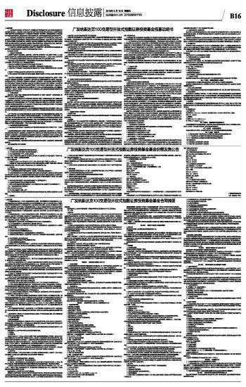 (上接B13版) 3.认购手续:投资人直接通过发售代理机构办理认购。 (1)开立深圳证券交易所A股账户或证券投资基金账户。 (2)在认购前向资金账户中存入足够的认购资金。 (3)投资人可通过填写认购委托单、电话委托、磁卡委托、网上委托等方式申报认购委托,可多次申报,不可撤单,申报一经确认,认购资金即被冻结。 五、网下现金认购 1.认购时间:2015年5月20日至2015年月6月2日(周六、周日和节假日不受理)9:30至16:30。 2.认购限额:网下现金认购以基金份额申请。投资人通过基金管理人办理网下现金认购的,每笔认购份额须在5万份以上(含5万份)。投资人可以多次认购,累计认购份额不设上限。 3.认购手续 投资人到基金管理人直销网点提供下列资料办理基金的认购手续: (1)个人投资者提供身份证件原件及复印件(如为第二代身份证需正反面复印件); (2)机构投资者提供企业营业执照正本或副本原件、组织机构代码证原件、税务登记证原件及加盖单位公章的复印件;事业法人、社会团体或其他组织提供民政部门或主管部门颁发的注册登记证书原件及加盖单位公章的复印件;法定代表人授权委托;业务经办人有效身份证件原件及复印件(身份证、军人证或护照); (3)深圳证券交易所A股账户卡或证券投资基金账户卡(原件和复印件); (4)加盖银行受理章的汇款凭证回单原件及复印件。 4.投资人办理认购前应将足额认购资金汇入本公司指定的在中国工商银行开立的直销资金专户: 户名:广发基金管理有限公司直销专户 账号:3602000129838383823 开户行:中国工商银行广州第一支行 投资人所填写的票据在汇款用途中必须注明购买的基金名称和基金代码,并确保认购期间每日16:30前到账。 5.注意事项: (1)投资人在认购时不能使用广发基金管理有限公司开放式基金账户,而需使用深圳证券交易所A股账户卡或证券投资基金账户卡。 (2)若个人投资者的认购资金在认购申请当日16:30之前未到达本公司指定的直销资金专户,则当日提交的申请顺延受理,如由于网银系统原因导致到账时间晚于当日16:30的,可顺延至当日下午企业网银关闭的最后时间。 (3)投资人若未按上述规定划付款项,造成认购无效的,本公司及直销专户的开户银行不承担任何责任。 六、清算与交割 1.基金募集期间募集的资金存入专门账户,在基金募集行为结束前,任何人不得动用,认购款项在募集期间产生的利息将折算为基金份额,归投资人所有。 2.本基金持有人权益登记由登记结算机构在基金募集结束后完成。 七、基金资产的验资与基金合同生效 1.本基金自基金份额发售之日起3个月内,在基金募集份额总额不少于2亿份,基金募集金额不少于2亿元人民币且基金认购人数不少于200人的条件下,基金管理人依据法律法规及招募说明书可以决定停止基金发售,并在10日内聘请法定验资机构验资,自收到验资报告之日起10日内,向中国证监会办理基金备案手续。 基金募集达到基金备案条件的,自基金管理人办理完毕基金备案手续并取得中国证监会书面确认之日起,《基金合同》生效;否则《基金合同》不生效。基金管理人在收到中国证监会确认文件的次日对《基金合同》生效事宜予以公告。基金管理人应将基金募集期间募集的资金存入专门账户,在基金募集行为结束前,任何人不得动用。 2.如果募集期限届满,未满足募集生效条件,则基金募集失败,基金管理人应以其固有财产承担因募集行为而产生的债务和费用,在基金募集期限届满后30日内返还投资者已缴纳的款项,并加计银行同期活期存款利息。如基金募集失败,基金管理人、基金托管人及销售机构不得请求报酬。基金管理人、基金托管人和销售机构为基金募集支付之一切费用应由各方各自承担。 八、本次募集有关当事人或中介机构 (一)基金管理人 名称:广发基金管理有限公司 住所:广东省珠海市横琴新区宝中路3号4004-56室 办公地址:广州市海珠区琶洲大道东一号保利国际南塔31-33楼 法定代表人:王志伟 联系人:段西军 联系电话:020-89899117 传真:020-89899069 (二)基金托管人 名称:中国银行股份有限公司 住所:北京市西城区复兴门内大街1号 办公地址:北京市西城区复兴门内大街1号 法定代表人:田国立 客服电话:95566 公司网站:www.boc.cn (三)销售机构 本基金的销售机构名单详见本基金发售公告“一、本次募集基本情况(七)基金份额发售机构”部分的相关内容。 本基金募集期内,本公司可能增加新的销售机构,并另行公告。投资人可留意相关公告信息或拨打本公司客户服务电话进行查询。 (四)登记结算机构 名称:中国证券登记结算有限责任公司 住所、办公地址:北京市西城区太平桥大街17号 法定代表人:金颖 联系人:崔巍 电话:010-59378856 传真:010-59378907 (五)出具法律意见书的律师事务所 名称:国浩律师(广州)事务所 住所:广东省广州市体育西路189号城建大厦9楼 负责人:程秉 电话:020-38799345 传真: 020-38799335 经办律师:黄贞、邹志峰 联系人:程秉 (六)审计基金资产的会计师事务所 德勤华永会计师事务所(特殊普通合伙) 办公地址:上海市延安东路222号外滩中心30楼 法人代表:卢伯卿 电话:021-61418888 传真:021-63350003 经办注册会计师:王明静、吴迪 广发基金管理有限公司 二零一五年五月十五日 本版导读: