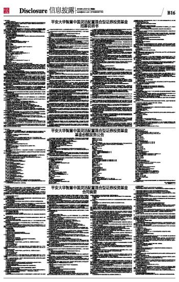 平安大华智慧中国灵活配置混合型证券投资基金 招募说明书 (上接B15版) (六)基金财产清算的公告 清算过程中的有关重大事项须及时公告;基金财产清算报告经会计师事务所审计并由律师事务所出具法律意见书后报中国证监会备案并公告。基金财产清算公告于基金财产清算报告报中国证监会备案后5个工作日内由基金财产清算小组进行公告。 (七)基金财产清算账册及文件的保存 基金财产清算账册及有关文件由基金托管人保存15年以上。 八、争议的处理和适用的法律 对于因本合同的订立、内容、履行和解释或与本合同有关的争议,合同当事人应尽量通过协商、调解途径解决。不愿或者不能通过协商、调解解决的,任何一方均有权将争议提交位于深圳的华南国际经济贸易仲裁委员会进行仲裁。仲裁裁决是终局性的并对各方当事人具有约束力,仲裁费用由败诉方承担。 争议处理期间,基金合同当事人应恪守各自的职责,继续忠实、勤勉、尽责地履行基金合同规定的义务,维护基金份额持有人的合法权益。 《基金合同》受中国法律管辖。 九、基金合同存放地和投资者取得基金合同的方式 《基金合同》可印制成册,供投资者在基金管理人、基金托管人、销售机构的办公场所和营业场所查阅。 附件二:托管协议内容摘要 一、基金托管协议当事人 (一)基金管理人 名称:平安大华基金管理有限公司 住所:深圳市福田区福华三路星河发展中心大厦酒店01:419 办公地址:深圳市福田区福华三路星河发展中心五楼 邮政编码:518048 法定代表人:杨秀丽 成立时间:2011年1月7日 批准设立机关及批准设立文号:中国证监会 证监许可【2010】1917号 组织形式:有限责任公司(中外合资) 注册资本:人民币30000万元 存续期间:持续经营 (二)基金托管人 名称:平安银行股份有限公司(简称:平安银行) 住所:中华人民共和国广东省深圳市罗湖区深南东路5047 号 办公地址:广东省深圳市深南东路5047 号 法定代表人:孙建一 成立日期:1987 年12 月22 日。 组织形式:股份有限公司 注册资本: 5,123,350,416 元 存续期间:持续经营 基金托管资格批文及文号:中国证监会证监许可[2008]1037 号 联系人:李玉彬 联系电话:(0755) 2216 8677 经营范围:办理人民币存、贷、结算、汇兑业务;人民币票据承兑和贴现 各项信托业务;经监管机构批准发行或买卖人民币有价证券;发行金融债券;代理发行、代理兑付、承销政府债券;买卖政府债券;外汇存款、汇款;境内境外借款;从事同业拆借;外汇借款;外汇担保;在境内境外发行或代理发行外币有价证券;买卖或代客买卖外汇及外币有价证券、自营外汇买卖;贸易、非贸易结算;办理国内结算;国际结算;外币票据的承兑和贴现;外汇贷款;资信调查、咨询、见证业务;保险兼业代理业务;代理收付款项;黄金进口业务;提供信用证服务及担保;提供保管箱服务;外币兑换;结汇、售汇;信用卡业务;经有关监管机构批准或允许的其他业务。 二、基金托管人对基金管理人的业务监督和核查 (一)基金托管人根据有关法律法规的规定及基金合同的约定,对基金投资范围、投资对象进行监督。 基金合同明确约定基金投资风格或证券选择标准的,基金管理人应按照基金托管人要求的格式提供投资品种池和交易对手库,以便基金托管人运用相关技术系统,对基金实际投资是否符合基金合同关于证券选择标准的约定进行监督,对存在疑义的事项进行核查。 本基金的投资范围为具有良好流动性的金融工具,包括国内依法发行上市的股票(包括中小板、创业板及其他经中国证监会核准发行上市的股票)、债券(包括国债、央行票据、金融债券、企业债券、公司债券、中期票据、短期融资券、超短期融资券、次级债券、政府支持机构债、政府支持债券、地方政府债、可转换债券(含分离交易可转债)及其他经中国证监会允许投资的债券)、资产支持证券、债券回购、银行存款(包括协议存款、定期存款及其他银行存款)、货币市场工具、权证、股指期货以及经中国证监会允许基金投资的其他金融工具(但须符合中国证监会相关规定)。 在不改变基金投资目标、不改变基金风险收益特征的条件下,履行适当程序后,本基金可参与证券投资基金、同业存单的投资,具体投资比例限制、证券投资基金的投资策略、估值方法按届时有效的法律法规和监管机构的规定执行。如法律法规或监管机构以后允许基金投资其他品种,基金管理人在履行适当程序后,可以将其纳入投资范围。 基金的投资组合比例为:本基金股票投资占基金资产的比例范围为0-95%,投资于高端装备制造、工业4.0、互联网主题相关证券不低于非现金基金资产的80%。本基金每个交易日日终在扣除股指期货合约需缴纳的交易保证金后,应当保持不低于基金资产净值5%的现金或者到期日在一年以内的政府债券。 本基金参与股指期货交易,应符合法律法规规定和基金合同约定的投资限制并遵守相关期货交易所的业务规则。 如果法律法规或中国证监会变更投资品种的投资比例限制,基金管理人在履行适当程序后,可以调整上述投资品种的投资比例。 (二)基金托管人根据有关法律法规的规定及基金合同的约定,对基金投资、融资比例进行监督。基金托管人按下述比例和调整期限进行监督: 基金的投资组合应遵循以下限制: 1、本基金股票投资占基金资产的比例范围为0-95