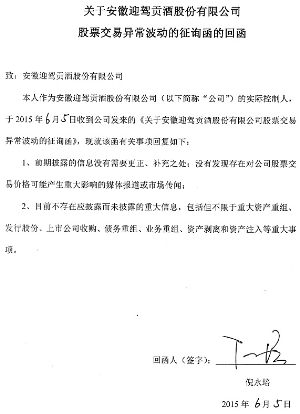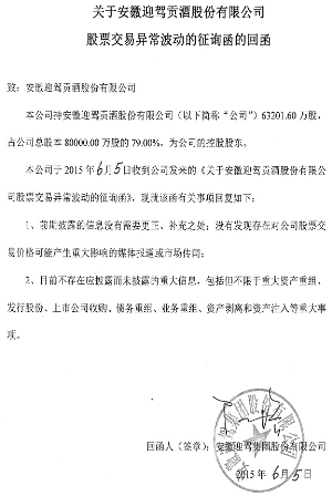 本公司董事会及全体董事保证本公告内容不存在任何虚假记载、误导性陈述或者重大遗漏,并对其内容的真实性、准确性和完整性承担个别及连带责任。 重要内容提示: 安徽迎驾贡酒股份有限公司(以下简称“本公司”或“公司”)股票(股票简称:迎驾贡酒 股票代码:603198)于2015年6月3日、6月4日、6月5日连续三个交易日内日收盘价格涨幅偏离值累计超过20%,属于股票交易异常波动。 经本公司自查,并向公司控股股东及实际控制人发函征询,确认不存在应披露而未披露的重大信息。 一、股票交易异常波动的具体情况 本公司股票于2015年6月3日、6月4日、6月5日连续三个交易日内日收盘价格涨幅偏离值累计超过20%,根据《上海证券交易所交易规则》的有关规定,属于股票交易价格异常波动。 二、公司关注并核实的相关情况 1、经公司自查,公司目前生产经营正常,公司前期披露的信息不存在需要更正、补充之处;公司不存在其他应披露而未披露的重大信息。 2、经公司自查,并向公司控股股东安徽迎驾集团股份有限公司、实际控制人倪永培先生书面征函确认,已披露的信息没有需要更正、补充之处,没有发现对公司股票交易价格可能生产重大影响的媒体报道或市场传闻,不存在其他应披露而未披露的重大信息,包括但不限于重大资产重组、发行股份、上市公司收购、债务重组、业务重组、资产剥离和资产注入等重大的事项。 三、是否存在应披露而未披露的重大信息的声明 本公司董事会确认,根据《上海证券交易所股票上市规则》等有关规定,公司目前不存在应披露而未披露的事项或与该事项有关的筹划、商谈、意向、协议等,董事会也未获悉本公司有根据《上海证券交易所股票上市规则》等有关规定应披露而未披露的、对本公司股票及其衍生品种交易价格产生较大影响的信息。 四、上市公司认为必要的风险提示 有关公司信息以公司在上海证券交易所(www.sse.com.cn)及公司指定信息披露媒体(《上海证券报》、《证券时报》、《中国证券报》、《证券日报》)的相关公告为准,敬请广大投资者理性投资,注意投资风险。 特此公告。 安徽迎驾贡酒股份有限公司董事会 2015年6月5日 ■ ■ ■ 本版导读: