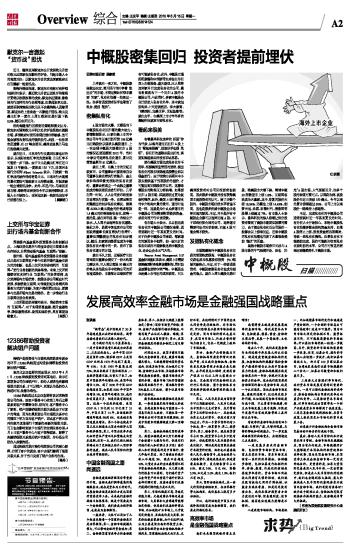 上交所与华宝证券 进行场内基金创新合作 围绕场内基金场外投资服务业务创新试点,上海证券交易所与华宝证券近日签署业务合作协议,共同推动场内基金“互联网+”创新。 据介绍,场内基金场外投资服务业务创新试点是对互联网客户参与交易所场内基金交易方式的创新,也是上交所支持券商利用“互联网+”进行业务创新的具体举措。未来上交所将继续研究支持行业“互联网+”的各类举措,充分发挥场内市场优势,鼓励证券公司顺应时代发展,积极借助互联网,对传统经纪业务模式和服务方式进行创新,为客户提供更加安全、便捷参与交易所场内交易的路径,进一步推动行业互联网证券业务发展。 上交所副总经理谢玮表示,推动资本市场的“互联网+”,对于实现普惠金融,提升金融效率、降低融资成本、助推实体经济,具有重要战略意义。(朱凯)