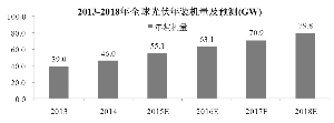 根据国家能源局公布的数据,2014年全国新增光伏发电装机容量达到10.60GW,而根据国家能源局公告的2015年《光伏发电建设实施方案》,2015年的全国新增太阳能装机目标调整至17.80GW,除对2014年未完工的专案提出追加管理外,也进一步放宽了分布式太阳能发电的建设限制。同时,根据中国可再生能源协会的预计,我国到2020年光伏累计装机量有望达到100GW。
