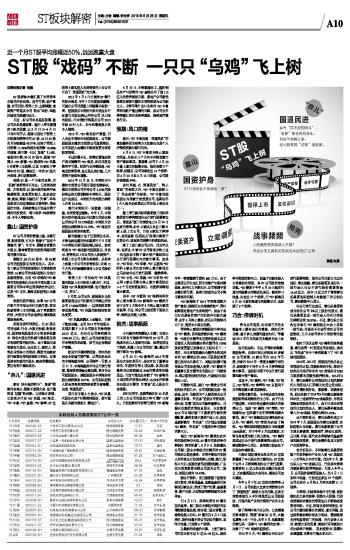 证券时报记者 岳薇 ST股群体大概汇集了中国资本市场的所有戏码。连年亏损、破产重整、官司诉讼、暂停上市、立案调查、变卖资产等是其中的“狗血”戏份,风险厌恶者自然避而远之。 不过 ,好公司未必是好股票,差公司未必是差股票。抛开上周市场剧烈下跌的因素,以5月12日-6月12日为时间节点,剔除目前处于暂停上市阶段和停牌中的ST股,32只ST股的月均涨幅逾49.57%,远高于同期上证指数17.38%和创业板指数19.98%的涨幅,真可谓一只只“乌鸡”飞上树。 夸张的时候,55只ST股中,剔除*ST博元、*ST新都、*ST集成和*ST凤凰4只暂停上市股票,以及18家处于停牌中的ST股,剩余近一半的ST股天天收涨,多只连续涨停。 综观ST股一个月来的走势,用“妖娆”来形容并不为过。记者梳理发现,归根到底,ST股天然的保壳冲动暗藏预期,或变更实控人,或启动定增、重组,即使不搞任何“大事”,单单是股权大战也能挑动市场神经,推动股价大涨。那些依靠公开信息并勇于博弈的投资者,每日坐享5%涨停收益,不令人艳羡也难。 靠山:国资护身 ST公司尽管经营能力差、业绩亏损、财务困难,可不少“败家子”却有个靠谱的“爹”。牛市中,跟随有背景的大股东,意味着更低的投资风险和更高的潜在收益。 据统计,55只ST股中,有26家公司的控股股东为国有法人。其中,有7家公司的实际控制人为国务院国资委,16家公司的实际控制人为地方各级国资委。另有*ST华锦和*ST秦岭的实际控制人分别为中国兵器工业集团公司和中华全国供销合作总社;以及*ST古汉,最终实际控制人为教育部。 根据交易所规定,如果*ST公司在第三年年报公布时仍然亏损,将面临被暂停上市的风险,由于壳资源的价值,大部分公司会选择定增收购或重组来保壳。 招商证券研报指出,在ST股公司的地域、行业、大股东性质、财务状况、股本结构及股本大小等各种因素中,唯有大股东的性质与重组是否成功有较明显的相关性。由于重组关系到原有大股东、企业员工、债权人、借壳企业等各方的利益,需要当地政府进行政策支持和协调各方利益。如果是国有性质的大股东,政府背景较强,更加有利于重组成功。 “弃儿”:国退民进 家有“扶不起的阿斗”,“老爹”即使再有来头,恨铁不成钢之余,也可能将其“过继”给别家。记者统计发现,目前至少已有*ST凤凰、*ST海龙、*ST中鲁、*ST金路、*ST春晖、ST宜纸等6家实控人为国资委的上市公司开启了“国退民进”的大幕。 2013年7月3日才摘掉ST帽子的恒天海龙,今年3月再度披星戴帽,而就在公司再度登上风险警示板前一周,控股股东中国恒天宣布通过公开征集方式协议转让所持公司23.15%的股权。而中国恒天即是在公司2012年被ST时入主,如今风景变换之快令人错愕。 2012年,*ST海龙破产重整,引入央企中国恒天为控股股东,公司原控股股东潍坊市投资公司退居第四,公司实控人由潍坊市政府变更为国务院国资委。 不过好景不长,依靠处置流动资产成功摘帽的*ST海龙,此后再度连续两年亏损。粘胶行业持续低迷,*ST海龙经营困难,也正是从这时起,几大国资开始萌生退意。 2014年12月29日,中国恒天与潍坊市投资公司签订股份划转协议,潍坊市投资公司所持公司3.57%的股份将全部无偿划转给中国恒天,股份过户完成后,中国恒天的持股比例将上升至33.34%。 然而中国恒天一面接盘一面抛盘,为国资退出铺垫。今年3月,中国恒天宣布拟通过公开征集方式协议转让所持公司23.15%股份,中国恒天的持股比例将降为10.19%。*ST海龙的控股股东将发生变更。 新的接盘方也于近期浮出水面。主营电线电缆的兴乐集团已于5月底与中国恒天签订股份转让协议,前者将成为*ST海龙新的控股股东,并表示,将择机向上市公司注入优质资产,实现上市公司主营业务转型,从根本上改善上市公司的经营状况,未来12个月内不排除继续增持上市公司股份的可能。 暂停上市一年有余的*ST凤凰能否恢复上市已经进入倒计时,不过,纵然*ST凤凰能够涅槃,也可能成为一名“弃儿”。 5月底,公司公告,控股股东长航集团拟通过公开征集的方式转让所持公司17.89%的股份,一旦国务院国资委批准同意,*ST凤凰的控制权将发生变更。 *ST凤凰隶属水上运输业,主营干散货运输。公司2014年年报显示,实现归属于上市公司股东的净利润 43.07 亿元,扣非后公司净利润为1946.56万元。然而,公司的经营层面并未得到根本改善,扭亏完全有赖破产重整。 航运大环境持续低迷,国内外航运企业普遍亏损严重。以同处航运业的中海海盛为例,公司隔年一亏损,6月11日,中海海盛发布非公开发行预案,览海投资现金全额包揽,晋身为公司控股股东。原控股股东中国海运持股比例将降至8.91%,公司实际控制人将由国务院国资委变更为密春雷,完成“国退民进”。 因而有市场人士表示,*ST凤凰大股东在这个时候卖掉股权,很可能是在为新的重组方“腾地方”。 6月10日,主营氯碱化工、塑料制品生产与经营的*ST金路公布了逾112亿元的借壳重组方案,房地产公司新光集团有望取代德阳市国资委成为公司新主人。主营苹果汁出口业务的*ST中鲁同样面临产能过剩的问题,该公司去年停牌邀江苏环亚借壳重组,转型医疗服务行业。 预期:风口的猪 然而,*ST中鲁这场“国退民进”的重组最终因为借壳方无法解决交易个人所得税税款问题而告吹。 4月9日,*ST中鲁宣布终止重组的消息,并表示,3个月内不再