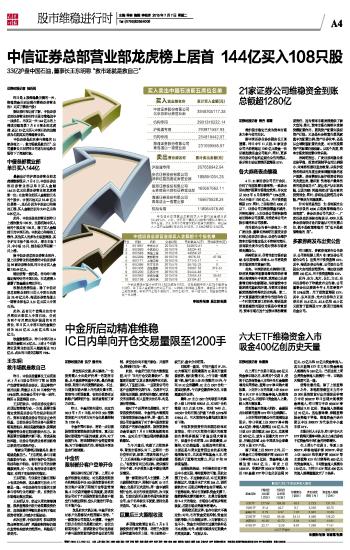 中信证券总部营业部龙虎榜上居首 144亿买入108只股