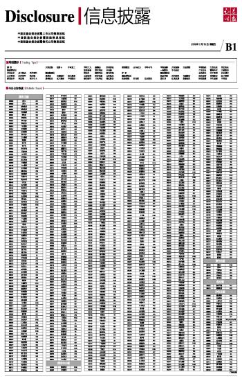 (下转B2版) 深市主板 000002 万科A B61 000002 万科A B65 000004 国农科技 B44 000004 国农科技 B89 000005 世纪星源 B41 000021 深科技 B65 000022 深赤湾A B56 000023 深天地A B77 000032 深桑达A B48 000033 *ST新都 B56 000042 中洲控股 B57 000046 泛海控股 B77 000050 深天马A B52 000055 方大集团 B87 000056 深国商 B93 000061 农产品 B60 000061 农产品 B68 000062 深圳华强 B93 000066 长城电脑 B41 000068 *ST华赛 B41 000069 华侨城A B69 000078 海王生物 B97 000090 天健集团 B60 000100 TCL集团 B97 000150 宜华健康 B125 000159 国际实业 B92 000333 美的集团 B41 000400 许继电气 B40 000401 冀东水泥 B106 000403 ST生化 B42 000416 民生控股 B68 000422 湖北宜化 B48 000426 兴业矿业 B41 000429 粤高速A B92 000498 山东路桥 B100 000501 鄂武商A B83 000504 南华生物 B123 000509 华塑控股 B106 000510 *ST金路 B71 000513 丽珠集团 B82 000517 荣安地产 B97 000524 岭南控股 B61 000529 广弘控股 B63 000532 力合股份 B79 000533 万家乐 B59 000539 粤电力A B61 000540 中天城投 B75 000544 中原环保 B68 000546 金圆股份 B43 000553 沙隆达A B107 000555 神州信息 B52 000561 烽火电子 B93 000563 陕国投A B89 000565 渝三峡A B59 000565 渝三峡A B71 000566 海南海药 B5 000568 泸州老窖 B66 000570 苏常柴A B73 000572 海马汽车 B70 000573 粤宏远A B64 000581 威孚高科 B76 000584 友利控股 B46 000587 金叶珠宝 B55 000589 黔轮胎A B69 000591 桐君阁 B43 000593 大通燃气 B104 000598 兴蓉环境 B98 000605 渤海股份 B82 000606 青海明胶 B76 000607 华媒控股 B60 000608 阳光股份 B61 000610 西安旅游 B87 000611 *ST蒙发 B100 000613 大东海A B75 000615 湖北金环 B91 000619 海螺型材 B67 000620 新华联 B47 000623 吉林敖东 B41 000637 茂化实华 B106 000650 仁和药业 B72 000651 格力电器 B106 000656 金科股份 B106 000661 长春高新 B108 000665 湖北广电 B5 000669 金鸿能源 B62 000670 盈方微 B39 000676 智度投资 B96 000679 大连友谊 B85 000679 大连友谊 B52 000685 中山公用 B89 000701 厦门信达 B85 000707 双环科技 B48 000708 大冶特钢 B6 000709 河北钢铁 B61 000712 锦龙股份 B52 000715 中兴商业 B80 000717 韶钢松山 B86 000718 苏宁环球 B38 000719 大地传媒 B61 000721 西安饮食 B116 000722 湖南发展 B94 000723 美锦能源 B67 000726 鲁泰A B34 000726 鲁泰A B79 000727 华东科技 B89 000728 国元证券 B33 000733 振华科技 B70 000735 罗牛山 B104 000736 中房地产 B62 000737 南风化工 B69 000748 长城信息 B62 000750 国海证券 B104 000752 西藏发展 B123 000757 浩物股份 B62 000759 中百集团 B94 000760 斯太尔 B43 000762 西藏矿业 B51 000768 中航飞机 B125 000776 广发证券 B79 000780 平庄能源 B76 000783 长江证券 B42 000789 万年青 B37 000791 甘肃电投 B55 000793 华闻传媒 B48 000795 太原刚玉 B69 000800 一汽轿车 B107 000801 四川九洲 B3 000801 四川九洲 B59 000806 银河投资 B47 000810 创维数字 B63 000812 陕西金叶 B48 000816 智慧农业 B97 000819 岳阳兴长 B67 000821 京山轻机 B43 000826 桑德环境 B43 000833 贵糖股份 B102 000850 华茂股份 B89 000851 高鸿股份 B99 000852 江钻股份 B59 000860 顺鑫农业 B91 000861 海印股份 B72 000863 三湘股份 B96 000868 安凯客车 B49 000875 吉电股份 B104 000876 新希望 B38 000878 云南铜业 B97 000881 大连国际 B44 000883 湖北能源 B67 000883 湖北能源 B98 000885 同力水泥 B75 000886 海南高速 B6 000888 峨眉山A B51 000895 双汇发展 B53 000899 赣能股份 B56 000902 新洋丰 B95 000908 景峰医药 B55 000908 景峰医药 B6 000909 数源科技 B93 000910 大亚科技 B48 000912 *ST天化 B39 000913 钱江摩托 B44 000919 金陵药业 B97 000920 南方汇通 B84 000920 南方汇通 B53 000921 海信科龙 B93 000925 众合科技 B76 000926 福星股份 B86 000927 *ST夏利 B34 000929 兰州黄河 B64 000931 中关村 B85 000933 神火股份 B107 000936 华西股份 B61 000937 冀中能源 B87 000939 凯迪电力 B75 000949 新乡化纤 B116 000950 建峰化工 B106 000950 建峰化工 B98 000952 广济药业 B102 000952 广济药业 B79 000958 东方能源 B4 000963 华东医药 B88 000966 长源电力 B82 000969 安泰科技 B4 000971 蓝鼎控股 B2 000972 新中基 B57 000973 佛塑科技 B47 000981 银亿股份 B64 000987 广州友谊 B40 000988 华工科技 B108 000989 九芝堂 B86 000990 诚志股份 B48 000993 闽东电力 B75 000995 *ST皇台 B73 深市中小板 002006 精功科技 B126 002009 天奇股份 B45 002011 盾安环境 B44 002012 凯恩股份 B104 002013 中航机电 B104 002014 永新股份 B72 002015 *ST霞客 B110 002017 东信和平 B82 002020 京新药业 B39 002024 苏宁云商 B32 002025 航天电器 B106 002026 山东威达 B63 002026 山东威达 B99 002027 七喜控股 B69 002030 达安基因 B82 002031 巨轮股份 B55 002034 美欣达 B52 002035 华帝股份 B53 002036 汉麻产业 B73 002037 久联发展 B71 002040 南京港 B62 002041 登海种业 B63 002043 兔宝宝 B40 002048 宁波华翔 B64 002051 中工国际 B104 002052 同洲电子 B60 002054 德美化工 B75 002056 横店东磁 B77 002056 横店东磁 B29 002059 云南旅游 B76 002060 粤水电 B94 002061 江山化工 B55 002062 宏润建设 B40 002067 景兴纸业 B44 002068 黑猫股份 B64 002076 雪莱特 B38 002078 太阳纸业 B47 002081 金螳螂 B93 002081 金螳螂 B32 002083 孚日股份 B39 002086 东方海洋 B83 002089 新海宜 B61 002090 金智科技 B6 002091 江苏国泰 B64 002096 南岭民爆 B67 002097 山河智能 B51 002103 广博股份 B76 002106 莱宝高科 B38 002112 三变科技 B67 002116 中国海诚 B77 002118 紫鑫药业 B79 002119 康强电子 B44 002120 新海股份 B68 002121 科陆电子 B68 002122 天马股份 B57 002126 银轮股份 B60 002127 新民科技 B69 002128 露天煤业 B72 002129 中环股份 B55 002130 沃尔核材 B49 002134 天津普林 B