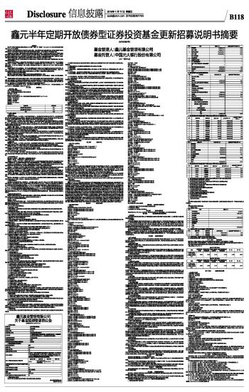 基金管理人:鑫元基金管理有限公司 基金托管人:中国光大银行股份有限公司 二〇一五年七月 重要提示 鑫元半年定期开放债券型证券投资基金(以下简称“基金”或“本基金”)于2014年11月5日经中国证监会证监许可[2014]1172号文注册募集。 基金管理人保证本招募说明书的内容真实、准确、完整。本招募说明书经中国证监会注册,但中国证监会对本基金募集的注册,并不表明其对本基金的价值和收益作出实质性判断或保证,也不表明投资于本基金没有风险。 本基金投资于证券市场,基金净值会因为证券市场波动等因素产生波动。投资有风险,投资者认购(或申购)基金份额时应认真阅读本招募说明书,全面认识本基金产品的风险收益特征,充分考虑投资者自身的风险承受能力,并对认购(或申购)基金的意愿、时机、数量等投资行为作出独立决策。基金管理人提醒投资者基金投资的“买者自负”原则,在投资者作出投资决策后,基金运营状况与基金净值变化导致的投资风险,由投资者自行负担。 本基金为债券型基金,属于证券投资基金中的较低风险品种,其预期风险与预期收益高于货币市场基金,低于混合型基金和股票型基金。 本基金为定期开放基金,以封闭运作和开放运作结合的方式运作,其封闭期为自基金合同生效之日起(包括基金合同生效之日)或自每一开放期结束之日次日起(包括该日)至该封闭期首日的6个月对日的前一日止。自每个封闭期结束之后第一个工作日起(包括该日)进入开放期,开放期最长不超过1个月,最短不少于5个工作日,期间可以办理申购与赎回业务。 本基金可投资中小企业私募债券,中小企业私募债券是指中小微型企业在中国境内以非公开方式发行和转让,约定在一定期限还本付息的公司债券,其发行人是非上市中小微企业,发行方式为面向特定对象的私募发行。因此,中小企业私募债券较传统企业债的信用风险及流动性风险更大,从而增加了本基金整体的债券投资风险。 基金的过往业绩并不预示其未来表现。 基金管理人管理的其它基金的业绩并不构成对本基金业绩表现的保证。基金 管理人依照恪尽职守、诚实信用、谨慎勤勉的原则管理和运用基金财产,但不保证基金一定盈利,也不保证最低收益。 本摘要根据基金合同和基金招募说明书编写,并经中国证监会核准。基金合同是约定基金当事人之间权利、义务的法律文件。基金投资人自依基金合同取得基金份额,即成为基金份额持有人和本基金合同的当事人,其持有基金份额的行为本身即表明其对基金合同的承认和接受,并按照《基金法》、《运作办法》、基金合同及其他有关规定享有权利、承担义务。基金投资人欲了解基金份额持有人的权利和义务,应详细查阅基金合同。 本招募说明书已经本基金托管人复核。本招募说明书所载内容截止日为2015年6月2日,有关财务数据截止日为2015年3月31日,净值表现截止日为2014年12月31日。 第一部分 基金管理人 一、基金管理人情况 名称:鑫元基金管理有限公司 住所:上海市浦东新区富城路99号震旦大厦31楼 法定代表人:束行农 设立日期:2013年8月29日 批准设立机关及批准设立文号:中国证券监督管理委员会证监许可[2013]1115号 组织形式:有限责任公司 注册资本:人民币2亿元 存续期限:永续经营 联系电话:021-20892000 股权结构: ■ 二、主要人员情况 1、董事会成员 束行农先生,董事长。1963年出生,中央党校经济管理学士。现任南京银行股份有限公司副行长。历任南京市城市信用合作联合社信联证券营业部副经理,南京城市合作银行信联证券部副经理、经理,南京市商业银行计划处处长助理、副处长、资金交易部副总经理、总经理,南京银行股份有限公司资金营运中心副总经理、总经理。 徐益民先生,董事。1962年出生,南京大学商学院EMBA。现任南京高科股份有限公司董事长兼党委书记。历任国营第七七二厂财务处会计、企管处干事、四分厂会计、劳资处干事、十八分厂副厂长、财务处副处长、处长、副总会计师兼处长,南京(新港)经济技术开发区管委会会计财处处长,南京新港开发总公司副总会计师,南京新港高科技股份有限公司董事长兼总裁、兼任党委书记。 李湧先生,董事,总经理。1972年出生,厦门大学MBA。历任厦门国际信托投资公司信贷部、营业部、计划部经理助理,厦信证券北京营业部副总经理,天同证券有限责任公司上海网上经纪业务部总经理,天同基金管理有限公司行业研究员,汇添富基金管理有限公司营销管理部总监、稽核监察部总监。 陆国庆先生,独立董事。1965年出生,南京大学企业管理博士,南京大学经济学博士后。现任湖南大学金融学院研究所长。历任湖南省岳阳市国土管理局地产管理副主任科员,湖南省国土管理局地产管理主任科员,广发证券股份有限公司证券研究、投资银行部门副总经理。 安国俊女士,独立董事。1972年出生,中国人民大学财政学博士。现任中国社会科学院金融研究所副研究员、硕士生导师。历任财政部主任科员、中国工商银行总行金融市场部高级经理。 王艳女士,独立董事。1978年出生,上海交通大学金融学博士。现任深圳大学经济学院金融系副教授。历任北京大学经济学院应用经济学博士后流动站职员,中国证监会深圳监管局行业调研主任科员等。 2、监事会成员 潘瑞荣先生,监事长。1975年出生,硕士