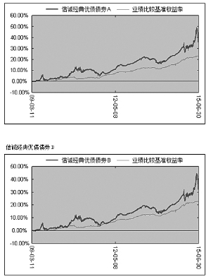 基金管理人:信诚基金管理有限公司 基金托管人:中国建设银行股份有限公司 报告送出日期:2015年7月20日 §1 重要提示 基金管理人的董事会及董事保证本报告所载资料不存在虚假记载、误导性陈述或重大遗漏,并对其内容的真实性、准确性和完整性承担个别及连带责任。 基金托管人中国建设银行股份有限公司根据本基金合同规定,于2015年7月16日复核了本报告中的财务指标、净值表现和投资组合报告等内容,保证复核内容不存在虚假记载、误导性陈述或者重大遗漏。 基金管理人承诺以诚实信用、勤勉尽责的原则管理和运用基金资产,但不保证基金一定盈利。 基金的过往业绩并不代表其未来表现。投资有风险,投资者在作出投资决策前应仔细阅读本基金的招募说明书。 本报告中财务资料未经审计。 本报告期自2015年4月1日起至6月30日止。 §2 基金产品概况 ■ §3 主要财务指标和基金净值表现 3.1 主要财务指标 单位:人民币元 ■ 注:1、上述基金业绩指标不包括持有人认购或交易基金的各项费用,计入费用后实际收益水平要低于所列数字。 2、本期已实现收益指基金本期利息收入、投资收益、其他收入(不含公允价值变动收益)扣除相关费用后的余额,本期利润为本期已实现收益加上本期公允价值变动收益。 3.2 基金净值表现 3.2.1 本报告期基金份额净值增长率及其与同期业绩比较基准收益率的比较 信诚经典优债债券A ■ 信诚经典优债债券B ■ 3.2.2 自基金合同生效以来基金累计净值增长率变动及其与同期业绩比较基准收益率变动的比较 信诚经典优债债券A ■ 信诚经典优债债券B ■ 注:本基金建仓期自2009年3月11日至2009年9月10日,建仓期结束时资产配置比例符合本基金基金合同规定。 §4 管理人报告 4.1 基金经理(或基金经理小组)简介 ■ 注:1.上述任职日期、离任日期根据本基金管理人对外披露的任免日期填写。 2.证券从业的含义遵从行业协会《证券业从业人员资格管理办法》的相关规定。 4.2 管理人对报告期内本基金运作遵规守信情况的说明 在本报告期内,本基金管理人严格按照《证券投资基金法》和其他相关法律法规的规定以及《信诚经典优债债券型证券投资基金基金合同》、《信诚经典优债债券型证券投资基金招募说明书》的约定,本着诚实信用、勤勉尽职的原则管理和运用基金财产。本基金管理人通过不断完善法人治理结构和内部控制制度,加强内部管理,规范基金运作。本报告期内,基金运作合法合规,没有发生损害基金份额持有人利益的行为。 4.3 公平交易专项说明 4.3.1 公平交易制度的执行情况 根据中国证监会颁布的《证券投资基金管理公司公平交易制度指导意见》,以及公司拟定的《信诚基金公平交易管理制度》,公司采取了一系列的行动实际落实公平交易管理的各项要求。各部门在公平交易执行中各司其职,投资研究前端不断完善研究方法和投资决策流程,确保各投资组合享有公平的投资决策机会,建立公平交易的制度环境;交易环节加强交易执行的内部控制,利用恒生交易系统公平交易相关程序,及其它的流程控制,确保不同基金在一、二级市场对同一证券交易时的公平;公司同时不断完善和改进公平交易分析系统,在事后加以了严格的行为监控,分析评估以及报告与信息披露。当期公司整体公平交易制度执行情况良好,未发现有违背公平交易的相关情况。 4.3.2 异常交易行为的专项说明 本报告期内,未发现本基金与其它投资组合之间有可能导致不公平交易和利益输送的异常交易。报告期内,未出现参与交易所公开竞价同日反向交易成交较少的单边交易量超过该证券当日成交量5%的交易(完全复制的指数基金除外)。 4.4 报告期内基金的投资策略和运作分析 2015年二季度以来,全球经济整体维持温和复苏态势。发达国家复苏进程好于新兴市场,美国经济一季度意外收缩但不改长期温和复苏趋势,欧元区在QE政策刺激下实现快速复苏,日本经济复苏动力有所减弱。新兴市场整体面临经济减速与资本流出,特别是资源输出国受强势美元与商品价格下跌影响面临滞胀风险。其中,希腊债务问题仍是欧元区经济的最大隐患。由于未来数月希腊仍有巨额到期债务逼近,希腊债务问题仍将在长时间内困扰欧元区,而欧元区下半年的复苏进程可能也将受此拖累而出现减速。 中国经济面临惯性下滑压力,二季度企稳迹象初显。上半年一季度我国经济三大需求均出现持续下滑,GDP已回落至7%的6年来最低水平,平减指数负增长显示通缩压力较大。二季度投资增速下降趋势放缓,消费增速企稳,出口降幅收窄,三大需求初步改善显示经济正逐步逼近周期底部,企稳迹象初显。 二季度以来,央行多次降准降息,一定程度上缓解了实体经济融资成本高企问题。未来资金价格维持较低水平将是常态。在报告期内,债市难有波澜,在资本利得难以大起大落的情况下,套息依然是本基金的最优选择。随着转债的陆续到期赎回,剩余标的稀缺,存在套利空间。 回顾一、二季度经济走势,中国经济尽管面临持续下行的巨大压力,但深层次的制度和结构调整正在逐步推进。当前我国经济正在经历“不破不立”的艰难转型过程,只有破除旧有的体制,才能建立新的发展模式。而只有经历这个苦涩的过程,才能孕育中国经济的新希望,最终“柳暗花明”。预计三季度我国“改革红利”将