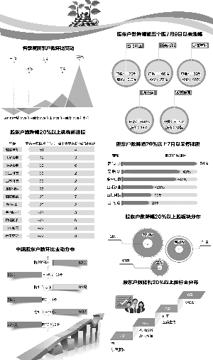 近一个月大盘剧烈震荡,极端行情多次显现。股东户数作为追踪主力动向的重要指标之一,筹码集中度在一定程度上反应了机构与散户的博弈情况。 证券时报数据中心根据上市公司半年报以及交易所互动平台统计,中期可比公司股东户数环比增长24%,持股明显分散。不难发现,在截至6月30日的下跌行情中,机构离场迹象明显,从二季度股票型与混合型基金仓位大幅下降20个百分点同样可以得到印证。值得一提的是,在之前的4个季度,股东户数环比变动幅度保持在-1%~5%之间,整体波动不大,即便是去年四季度牛市开启以及今年一季度的攀升阶段,A股市场整体股东户数均未发生明显变化。 整体看,中期持股集中度较一季度明显分散,但仍有206只个股股东户数出现不同程度的下降,占比37%,其中,62只下降幅度超过两成,筹码集中化趋势显著。比如一季度上市的次新股富临精工,一季度末股东户数为27824户,中期骤降至8379户,降幅高达七成。次新股中泰股份股东户数也由34230户降至11592户,降幅66%。年内上市的龙津药业、诚益通等股东户数降幅均超过五成。 除次新股外,一季度最大涨幅超过两倍的永大集团,二季度股价持续震荡,股东户数下降55%,透露出机构吸筹迹象。该股自7月2日起停牌,因此6月末的股东户数更具有参考价值。 股东户数下降20%以上的62只个股中,创业板与中小板占比高达八成,中小创股流通盘小、股性活跃,更容易成为主力资金角逐的目标。行业分布显示,“互联网+”上半年持续站上风口,计算机行业成为筹码最为集中的行业,8只个股入围;业绩与股价穿越牛熊的医药行业,6只个股中期股东户数下降逾两成,排名第二。 在各方维稳推动下,市场一度走出十天的反弹行情,但本周初的暴跌将前期涨幅吞噬大半,各大核心指数均已跌破“6·30”,7月9日以来累计涨幅几乎仅剩个位数,上证50指数更是创出6月大跌以来的新低。相比之下,筹码集中股整体有不俗表现,平均上涨18%,完胜大盘。 (李千) 中期股东户数降幅排行 代码 简称 股东户数 环比 (%) 7月9日 以来涨跌 (%) 行业 300432 300435 002750 300430 002622 002740 000998 002374 000826 002258 300096 002019 002575 002107 300428 600309 002674 000925 002708 002205 300076 002679 300182 300042 300232 300155 002056 600562 000592 300402 002462 300410 000713 300425 300333 300235 300070 002149 002140 002601 002034 300403 300398 002507 002534 000735 000514 000043 000545 300378 002313 600390 002577 300086 002694 002193 002170 002239 002207 000926 300097 002001 富临精工 中泰股份 龙津药业 诚 益 通 永大集团 爱 迪 尔 隆平高科 丽鹏股份 桑德环境 利尔化学 易 联 众 亿帆鑫富 群兴玩具 沃华医药 四通新材 万华化学 兴业科技 众合科技 光洋股份 国统股份 GQY视讯 福建金森 捷成股份 朗科科技 洲明科技 安 居 宝 横店东磁 国睿科技 平潭发展 宝色股份 嘉 事 堂 正业科技 丰乐种业 环能科技 兆日科技 方直科技 碧 水 源 西部材料 东华科技 佰 利 联 美 欣 达 地尔汉宇 飞凯材料 涪陵榨菜 杭锅股份 罗 牛 山 渝 开 发 中航地产 金浦钛业 鼎捷软件 日海通讯 金瑞科技 雷柏科技 康芝药业 顾地科技 山东如意 芭田股份 金 飞 达 准油股份 福星股份 智云股份 新 和 成 -69.89 -66.13 -61.63 -59.25 -55.18 -54.29 -52.08 -50.94 -45.06 -43.27 -43.09 -41.11 -40.92 -40.77 -39.90 -38.61 -37.74 -36.66 -35.74 -35.17 -34.94 -33.16 -32.78 -32.55 -32.05 -31.54 -31.04 -29.98 -28.94 -28.41 -28.39 -28.10 -27.97 -27.59 -27.38 -27.37 -27.25 -27.18 -27.15 -27.01 -26.83 -26.77 -26.61 -25.05 -24.97 -24.79 -24.70 -24.48 -23.14 -23.10 -22.98 -22.72 -22.40 -22.27 -22.05 -21.88 -21.78 -21.26 -20.94 -20.70 -20.70 -20.42 0.60 26.82 16.28 13.82 0.00 0.00 32.01 11.18 23.17 36.02 0.00 31.11 0.00 -8.28 24.41 8.29 11.99 27.23 1.07 4.43 -2.22 14.62 0.00 64.66 16.00 -39.94 17.94 60.31 -21.98 29.90 48.06 0.00 32.99 53.30 33.83 22.78 30.35 29.28 15.39 14.55 26.78 28.51 38.37 9.62 10.52 45.81 22.21 24.45 0.00 9.50 27.31 9.76 0.00 17.53 16.10 3.01 -9.99 0.00 0.00 10.11 40.55 -9.42 汽车 机械设备 医药生物 机械设备 电气设备 轻工制造 农林牧渔 轻工制造 公用事业 化工 计算机 医药生物 轻工制造 医药生物 有色金属 化工 纺织服装 机械设备 汽车 建筑材料 电子 农林牧渔 计算机 计算机 电子 计算机 电子 建筑材料 农林牧渔 机械设备 医药生物 电子 农林牧渔 公用事业 计算机 计算机 公用事业 有色金属 建筑装饰 化工 纺织服装 家用电器 化工 食品饮料 电气设备 农林牧渔 房地产 房地产 化工 计算机 通信 有色金属 计算机 医药生物 建筑材料 纺织服装 化工 纺织服装 采掘 房地产 机械设备 医药生物 (本版专题数据由证券时报中心数据库提供,数据来源于上市公司公告,若有出入,请以公告为准。 杨霞/制图) 本版导读: