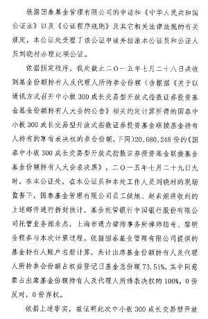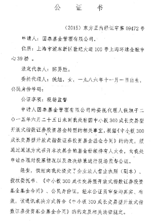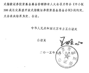 中小板300成长交易型开放式指数证券投资基金基金份额持有人大会表决结果暨决议生效的公告 依据《中华人民共和国证券投资基金法》、《公开募集证券投资基金运作管理办法》、《中小板300成长交易型开放式指数证券投资基金基金合同》的有关规定,现将中小板300成长交易型开放式指数证券投资基金(以下简称“中小成长ETF”或“本基金”)基金份额持有人大会的决议及相关事项公告如下。 一、基金份额持有人大会会议情况 中小成长ETF以通讯方式召开了基金份额持有人大会,大会投票表决起止时间为自2015年6月29日起至2015年7月28日17:00止。2015年7月29日,在本基金的基金托管人中国银行股份有限公司授权代表的监督下,本基金管理人对本次大会表决进行了计票,上海市通力律师事务所对计票过程进行了见证,北京市方正公证处对计票过程及结果进行了公证。 本次基金份额持有人大会权益登记日登记在册的中小板300成长交易型开放式指数证券投资基金及国泰中小板300成长交易型开放式指数证券投资基金联接基金(以下简称“联接基金”)的基金份额持有人及代理人均可参加本次持有人大会并参与表决。经统计,参加本次基金份额持有人大会投票表决的基金份额持有人及代理人所持参会份额(含根据本基金合同和《关于以通讯方式召开中小板300成长交易型开放式指数证券投资基金基金份额持有人大会的公告》的相关约定计算所得的联接基金持有人持有的享有表决权的参会份额数,下同)共计20,680,248份,占权益登记日本基金基金总份额28,132,924份的73.51%,达到法定开会条件,符合《中华人民共和国证券投资基金法》、《公开募集证券投资基金运作管理办法》和《中小板300成长交易型开放式指数证券投资基金基金合同》的有关规定。 本次大会审议了《关于中小板300成长交易型开放式指数证券投资基金转型有关事项的议案》(以下简称“本次会议议案”),并由参加大会的基金份额持有人及代理人对本次会议议案进行表决,表决结果为:20,680,248份同意,0份反对,0份弃权。同意本次大会议案的参会份额占参加本次会议表决的基金份额持有人及代理人所持表决权的100%,达三分之二以上,符合《中华人民共和国证券投资基金法》、《公开募集证券投资基金运作管理办法》和《中小板300成长交易型开放式指数证券投资基金基金合同》的有关规定,本基金转型有关事项的议案获得通过。 根据《公开募集证券投资基金运作管理办法》、《中小板300成长交易型开放式指数证券投资基金基金合同》的有关规定,经本基金托管人中国银行股份有限公司确认,本次基金份额持有人大会费用由基金资产列支,本次会议费用如下表: ■ 二、基金份额持有人大会决议生效情况 依据《中华人民共和国证券投资基金法》、《公开募集证券投资基金运作管理办法》的有关规定,基金份额持有人大会决定的事项自表决通过之日起生效。本次会议议案于2015年7月29日表决通过,自该日起本次持有人大会决议生效。决议内容如下: “根据《中华人民共和国证券投资基金法》、《公开募集证券投资基金运作管理办法》和《中小板300成长交易型开放式指数证券投资基金基金合同》有关规定,同意对中小板300成长交易型开放式指数证券投资基金实施转型并修改《中小板300成长交易型开放式指数证券投资基金基金合同》。为实施本基金转型方案,同意授权基金管理人办理本次转型的有关具体事宜,包括但不限于根据市场情况确定转型的具体时间和方式,根据现时有效的法律法规的要求和《中小板300成长交易型开放式指数证券投资基金转型方案说明书》的有关内容对《中小板300成长交易型开放式指数证券投资基金基金合同》进行必要的修改和补充,并根据《中小板300成长交易型开放式指数证券投资基金转型方案说明书》相关内容对本基金实施转型”。 本基金正式实施转型日为2015年8月27日。基金管理人将于表决通过之日起5日内报中国证监会备案。 三、转型方案实施情况 1、关于基金合同等法律文件的修订 根据《关于中小板300成长交易型开放式指数证券投资基金转型有关事项的议案》以及相关法律法规的规定,经与基金托管人中国银行股份有限公司协商一致,基金管理人已将《中小板300成长交易型开放式指数证券投资基金基金合同》、《中小板300成长交易型开放式指数证券投资基金托管协议》分别修订为《国泰国证新能源汽车指数分级证券投资基金基金合同》、《国泰国证新能源汽车指数分级证券投资基金托管协议》,并据此编制《国泰国证新能源汽车指数分级证券投资基金招募说明书》。中小成长ETF已经中国证监会证监许可[2015]563号(《关于准予中小板300成长交易型开放式指数证券投资基金变更注册的批复》)准予变更注册。《国泰国证新能源汽车指数分级证券投资基金基金合同》、《国泰国证新能源汽车指数分级证券投资基金托管协议》将自2015年8月27日起生效,原《中小板300成长交易型开放式指数证券投资基金基金合同》、《中小板300成长交易型开放式指数证券投资基金托管协议》将自同一日起失效。 2、关于选择期的安排和中小成长ETF终止上市交易 中小成长ETF将于本公告发布日(2015年7月30日)上午10:30复牌,并于本公告发布日(2015年7月30日)恢复办理申购和赎回业务。 本次
