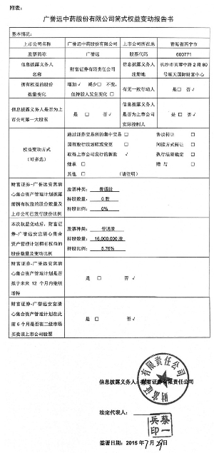 证券代码:600771 证券简称:广誉远 广誉远中药股份有限公司 简式权益变动报告书 上市公司名称:广誉远中药股份有限公司 股票上市地点:上海证券交易所 股票简称:广誉远 股票代码:600771 信息披露义务人:财富证券有限责任公司 住所:湖南省长沙市芙蓉中路2段80号顺天国际财富中心26楼 通讯地址:湖南省长沙市芙蓉中路2段80号顺天国际财富中心26楼 股份变动性质:股份增加 签署日期:2015年7月29日 信息披露义务人声明 1、信息披露义务人依据《中华人民共和国证券法》、《上市公司收购管理办法》、《公开发行证券的公司信息披露内容与格式准则第15号—权益变动报告书(2014年修订)》及相关的法律、法规编写本报告书。 2、信息披露义务人签署本报告已获得必要的授权和批准,其履行亦不违反信息披露义务人章程或内部规则中的任何条款,或与之相冲突。 3、依据《中华人民共和国证券法》、《上市公司收购管理办法》规定,本报告书已全面披露信息披露义务人管理的财富证券-广誉远安宫清心集合资产管理计划在广誉远中药股份有限公司中拥有权益的股份变动情况;截至本报告书签署之日,除本报告书披露的信息外,财富证券-广誉远安宮清心集合资产管理计划没有通过任何其他方式增加或减少其在广誉远中药股份有限公司中拥有权益的股份。 4、本次权益变动是根据本报告书所载明的资料进行的。信息披露义务人没有委托或者授权其他任何人提供未在本报告书中列载的信息和对本报告书做出任何解释或者说明。 5、信息披露义务人承诺本报告书不存在虚假记载、误导性陈述或重大遗漏,并对其真实性、准确性和完整性承担个别和连带法律责任。 6、本次取得上市公司发行的新股已于2015年6月2日获得中国证监会核准批复。 第一节 释义 在本报告书中,除非文义载明,以下简称具有如下含义: ■ 第二节 信息披露义务人介绍 一、信息披露义务人基本情况 企业名称:财富证券有限责任公司 住所:湖南省长沙市芙蓉中路2段80号顺天国际财富中心26楼 法定代表人:蔡一兵 注册资本:213,573万元 营业执照注册号码:430000000001292 企业类型及经济性质:有限责任公司 组织机构代码:74064802-1 主要经营范围:证券经纪;证券投资咨询;与证券交易、证券投资活动有关的财务顾问;证券承销与保荐;证券自营;证券资产管理;融资融券;证券投资基金代销;代销金融产品(许可有效期至2017年3月25日)。 经营期限:长期 税务登记证号码:地税:43010374068021 国税:430102740648021 主要股东及持股比例: ■ 通讯地址:湖南省长沙市芙蓉中路2段80号顺天国际财富中心26楼 邮政编码:410007 联系电话:0731-84779590 二、信息披露义务人董事及主要负责人的基本情况 ■ 三、信息披露义务人持有、控制其他上市公司股份情况 截至本报告书签署之日,财富证券-广誉远安宮清心集合资产管理计划未持有、控制其他境内、境外上市公司5%以上发行在外股份。 第三节 持股目的 一、本次认购目的 财富证券有限责任公司通过设立财富证券-广誉远安宮清心集合资产管理计划认购广誉远向其非公开发行的股份,对广誉远进行战略投资。 二、信息披露义务人是否拟在未来12个月内继续增持广誉远股份 本次财富证券-广誉远安宮清心集合资产管理计划认购广誉远非公开发行股份后,财富证券-广誉远安宮清心集合资产管理计划尚无在未来12个月内增持广誉远权益的计划。 第四节 权益变动方式 一、权益变动方式 根据财富证券与公司签署的《广誉远中药股份有限公司非公开发行股份之附条件生效的股份认购协议》及其补充协议的约定,财富证券通过设立的财富证券-广誉远安宮清心集合资产管理计划认购广誉远向其非公开发行的股份。 本次非公开发行完成后,财富证券-广誉远安宮清心集合资产管理计划持有广誉远1,600万股股份,占发行日广誉远已发行股票(普通股)数量的5.76%。 二、认购新股的种类、数量和比例、发行价格和定价依据、支付条件和支付方式 1、认购新股的种类 财富证券本次认购广誉远非公开发行的境内上市人民币普通股(A股)。 2、认购新股的数量和比例 根据公司第五届董事会第十次会议、第十六次会议以及公司2014年第一次临时股东大会、2015年第一次临时股东大会决议,本次非公开发行股票的数量为3,400万股。其中,财富证券管理的财富证券-广誉远安宮清心集合资产管理计划出资30,080万元认购1,600万股股份,占发行日广誉远已发行股票数量的5.76%。 3、发行价格和定价依据 本次非公开发行股票的发行价格不低于公司第五届董事会第十次会议决议公告日前20个交易日广誉远股票交易均价(定价基准日前20个交易日股票交易均价=定价基准日前20个交易日股票交易总额÷定价基准日前20个交易日股票交易总量)的90%,最终确定为18.80元/股。 若公司股票在定价基准日至发行日期间有派息/现金分红、送股、资本公积金转增股本等除权、除息事项的,将对发行价格作相应调整。 4、支付条件和支付方式 在本次非公开发行获得中国证监会核准后,财富证券应在收到广誉远和本次非公开发行保荐机构(主承销商)发出的《缴款通知书》后,按照广誉远与保荐机构(主承销商)确定的具体缴款日期将认购价款以现金方式一次性足额汇入保荐机构(主承销商)为本次非公开发行专门开立的账户。上述认购资金在会计师事