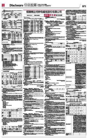 铜陵精达特种电磁线股份有限公司2015半年度报告摘要 2015-07-30 来源:证券时报网 作者: