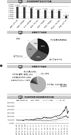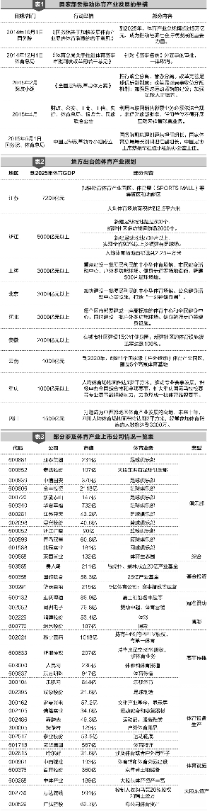 中国上市公司研究院 2022年冬奥会举办城市确定之前,A股体育相关上市公司走出一波上涨行情,特别是河北张家口的唯一上市公司河北宣工上演翻倍行情;但是当宣布北京获得2022年冬奥会的举办权后,相关体育个股却出现“见光死”,股价纷纷下跌。 难道体育股没有行情了?显然,获得冬奥会举办权为我国体育事业的发展再次增添光彩,现在北京冬奥才启动,而不是终点。随着我国经济实力增强,人们闲暇时间增多,人们对体育消费的需求将逐渐增加;另一方面,国家的顶层设计、政策支持为体育产业发展提供了制度保障和资源扶持,未来是体育产业的黄金10年。基于体育产业美好前景,一向嗅觉灵敏的资本市场也开始追捧体育产业。 体育产业结构不均衡 2013年,我国体育产业占GDP比重仅为0.56%,约为全球平均水平的1/4、发达国家的1/5,甚至1/6,足见发展水平落后。若比较人均体育产值,我国与其他发达国家更是有天壤之别,让我们这个GDP大国汗颜。但是,落后并不可怕,因为其中蕴育着巨大的机会、更大的改进空间。我国和相关国家体育产值占GDP比例情况,详情见图1。 我国体育产业不仅整体落后,结构也不合理。美国的体育产业发展很均衡,上游的体育观赏服务业占比达到25%,下游的体育用品生产业占比为30%,而体育健身服务业是美国体育产业最主要组成部分,占比为32%,详情见图2。 与美国比较,我国体育产业还处在初级阶段,大多停留在体育用品、鞋帽的生产使用上,涉及实质内容竞技表演和娱乐占比较小。我国体育用品、鞋帽产值占比接近80%,呈“一家独大”局面,详情见图3。在从体育大国迈向体育强国的过程中,体育服务业会得到持续的政策支持;消费者对体育用品的消费惯性会延续,对专业、高端的体育用品的需求会加速扩张。 体育核心产业中的竞技表演业和健身娱乐业在我国受到政策和职业竞技发展的限制,占比较小。在举国体制的支持下,我国在竞技体育方面获得了巨大的成功:2000年奥运会中国代表队获得金牌28枚,位居世界第三;2004年奥运会获得金牌32枚,位居世界第二;2008年北京奥运会获得金牌51枚,居世界第一。然而,在竞技体育风光无限的同时,我国商业体育、群众体育的发展却严重落后。我国商业体育的主要资源被相关主管部门、企业所占据,市场化程度低下;我国人均体育场地面积仅为美国的7.5%,公共健身设施缺乏。 中央和地方全面支持 体育产业的发展得到国家各个层面的高度重视,从顶层设计到底层执行都有详细规划,以确保体育产业的发展取得实际效果。习近平总书记多次在重要场合提到发展体育产业,对体育产业很关心。国家和部委也密集出台支持体育产业发展政策,几乎隔月便有政策出台,从整体规划到局部布局,涉及面之广,支持力度之大前所未有,详情见表1。 国务院在2014年10月20日印发的《关于加快发展体育产业促进体育消费的若干意见》中明确提出,到2025年,我国体育产业规模将达到5万亿元。也就是说,未来11年我国体育产值将以每年29%的高速复合增长率才能实现规划要求。此规划大幅超出市场预期,可见国家决心之大。 为响应国家号召,以及支持地方经济发展,各级地方政府也在2015年7月之前推出了地方体育发展政策,出台了类似《××省关于加快体育产业促进体育消费的若干意见》,涉及场馆建设、品牌树立、户外、健身中心、赛事等体育产业内容,表示出对体育产业发展的高度重视,详情见表2。 上市公司积极布局 一级市场投资体育产业热度逐渐升温。这些先知先觉的资本翘楚,在政策出台之前就已经开始布局体育产业,政策出台后继续加大力度。据统计,截至2015年4月,共有56家体育创业公司公布获得多项融资,按项目统计,其中综合25个、足球7个、高尔夫5个、健身5个、骑行4个、跑步3个、户外2个、滑雪2个、篮球2个、汽摩1个以及搏击1个。从投资领域看,大多是综合性、高端化、大众化子行业。这56家公司融资情况为:2014年之前4.45亿元,2014年25.05亿元,2015年截至4月12.25亿元,说明机构积极参与体育产业PE市场且投资额度逐年增加。 二级市场上市企业积极布局体育产业,目前已经有30多家上市公司涉足体育。它们涉及体育的方式各有不同,主要有以下四种方式:成立体育产业并购基金,如国旅联合、贵人鸟;收购体育产业公司,如苏宁云商、浙报传媒;通过产业链延伸切入体育产业领域,如乐视网;对已有业务做大做强,加大投资额度,如探路者、嘉麟杰。涉足体育产业相关上市公司,详情见表3。 拥有俱乐部相关业务的上市公司有以下特点:大部分企业市值庞大;多数企业涉足俱乐部已久;以其他产业为主,俱乐部为辅业;大部分企业属于传统产业,发展乏力;起初不以盈利为目的;单一球队对公司影响较弱,且处于烧钱状态。 已成立体育产业并购基金的上市公司有以下特点:跨界和延伸产业链,原有主业与体育存在一定联系;部分市值较大;入主体育意愿较强,并购基金规模一般比较大;主业一般为传统行业,成长性堪忧。 博彩相关上市公司有以下特点:博彩产业链的衍生,特许经营权;提供上游彩票印刷;国有企业较多,政策性较强。 与体育传播相关上市公司有以下特点:原有传播业务的延伸,目前渗透的公司大部分以前是其他内容为主的传播类公司;这类老牌传播公司一般市值较大,新设立的体育传播业务占比较小。 与体育相关设备类公司有以下特点:大