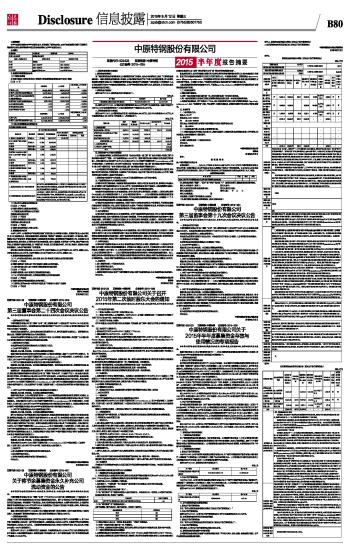 中原特钢股份有限公司2015半年度报告摘要 2015-08-12 来源:证券时报网 作者: