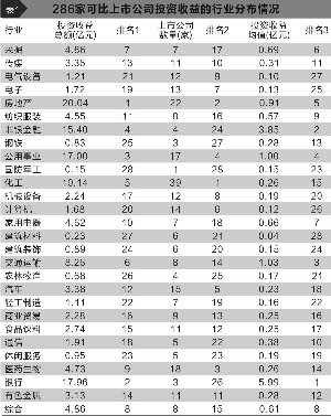 中国上市公司研究院 近年来,跟随着市场的节奏,上市公司的投资热情在不断变化,通过投资收益增厚业绩的上市公司屡见不鲜。仅以2012年至2014年年报中上市公司投资收益的数据来看,上市公司的投资热情是提升的。参与投资的上市公司由2012年的1984家上升至2014年的2319家,三年增长近17%。上市公司的投资收益主要来源于交易性金融资产、持有至到期金融资产、可供出售金融资产、长期股权投资等。相对于普通投资者,上市公司对于市场行情及各种消息的嗅觉更加灵敏。研究上市公司的投资收益情况,寻找一些善于投资的上市公司,对投资者在实际投资中选择投资标的具有一定的参考价值和指导意义。 上半年投资收益丰厚 随着2015年中报的披露,上市公司的期中“成绩”逐步揭晓。据证券时报数据中心统计,截至8月17日,沪深两市已有565家上市公司公布了投资收益方面的数据。总体上看,投资获利的上市公司占大多数,达449家,占比约79%。其中,投资收益在1亿元以上的有42家;投资收益在100万元到1亿元的有318家;另外89家上市公司的投资收益小于100万元。 金融行业独占鳌头,有3家公司投资收益超10亿元。这3家上市公司分别为:平安银行(21.04亿元)、光大证券(19.94亿元)、东吴证券(16.33亿元)。在今年上半年,东吴证券利润总额为24.62亿元,其投资收益对利润的贡献超五成以上,约占66%;平安银行与光大证券投资收益对利润总额的贡献率不如东吴证券高,分别为14%、32%。 除了金融业三家上市公司,其他投资收益紧跟其后的上市公司为万科A、京能电力、杉杉股份、大唐发电、TCL集团、南京高科、桂东电力,这7家上市公司投资收益均超过5亿元。其中,京能电力、大唐发电、桂东电力属公共事业,杉杉股份属综合业、TCL集团为家用电器业、万科A与南京高科为房地产业。 整体上来看,投资收益超亿元的上市公司中约有55%分布在公共事业、交通运输、金融和房地产这四个行业。 没有只赚不赔的买卖,上市公司的投资并非都是一帆风顺的,也有些公司出现了亏损。565家公布了投资收益的上市公司中,116家公司的投资收益为负。这116家上市公司投资活动不仅没有为业绩增光,反而拖了后腿。其中,投资亏损最多的是华夏银行,投资亏损2.75亿元。除华夏银行外,西部矿业、盘江股份、飞马国际、恒邦股份投资亏损相对较大,亏损额分别为0.5亿元、0.41亿元、0.19亿元、0.15亿元。除此之外,投资亏损在100万元到1000万元之间的上市公司有53家;另外58家上市公司的投资亏损小于100万元。 近年投资收益表现不一 2015上半年的一波牛市行情对上市公司投资活动或多或少会产生一定的影响,单以2015年上半年的数据来衡量上市公司的投资情况略显不足。于是,我们选取2012年至2015年的数据进行系统分析,看看哪些上市公司的投资具备持续向好的特点。 剔除2012年至2015年中报、年报中投资收益数据有缺失的上市公司,最后以286家上市公司为研究对象。以2012年至2015年中报、年报连续7个不同时期的“投资收益均值”衡量上市公司投资收益平均表现。 1、行业板块表现显差异 286家上市公司分布于28个不同的行业。上市公司分布在化工、房地产、医药生物、公用事业、汽车、计算机、电子、电气设备、机械设备、传媒、食品饮料、有色金属业的偏多,均在11家以上。另外一部分上市公司分布在商业贸易、纺织服装、交通运输、综合、采掘、家用电器、轻工制造、建筑材料、建筑装饰、通信、休闲服务、非银金融、农林牧渔、钢铁、银行、国防军工等行业(具体见表1)。 (1)化工业参与度较高 从上市公司的数量分布来看,化工业上市公司参与投资的热情度相对较高,囊括了39家上市公司。其中82%的化工业上市公司投资收益均值表现为盈利。和邦生物、兴发集团、天茂集团投资收益表现不俗,分别为2.05亿元、1.27亿元、1亿元。投资收益均值低于1亿元的化工业上市公司有29家,其中27家公司的投资收益均值在100万元以上,另外2家公司的投资收益均值在0-100万元之间。整体上看,化工业上市公司的投资获利情况表现较理想,仅7家上市公司投资收益均值为负。 房地产业的投资热情次之,有22家上市公司参与投资,占比约8%。除去空港股份、苏宁环球两家公司投资收益表现为亏损外,其他20家公司投资收益均值表现均为正。其中,新湖中宝、南京高科、陆家嘴、冠城大通、海航投资5家上市公司投资收益均值均在1亿元以上。 医药生物业参与度位列第三,囊括了18家上市公司。中恒集团与通策医疗为医药生物业的两个极端例子,中恒集团投资收益均值达2.64亿元,而通策医疗投资收益均值小于0。剩余16家上市公司中,除山东药玻外,另外15家上市公司的投资收益均值均在100万元以上。 另外,公共事业、汽车、计算机、电子业参与投资的上市公司数量分别为17家、15家、14家、13家;电器设备、机械设备业各有12家上市公司;传媒、食品饮料、有色金属业各有11家上市公司。 (2)金融业投资回报高 从上市公司投资收益均值来看,金融业回报较丰厚,如表1中的银行与非银金融业分别排名第一、第二。其次,交通运输、公用事业、房地产、采掘、家用电器、综合、纺织服装业投资收益的均值较高。 金融业有7家上市公司,3家属银行业,另4家为非银金融业。银行业的3家公司分别为平安银行、南京银行、华夏银行,它们投资收益均值