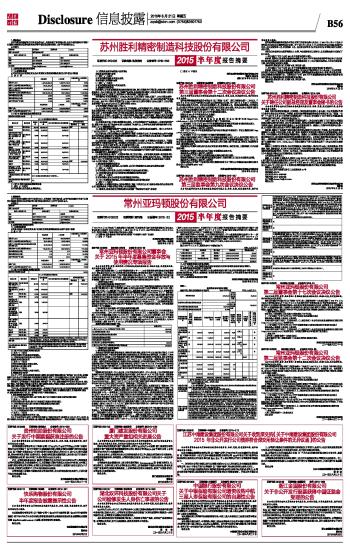 常州亚玛顿股份有限公司2015半年度报告摘要 2015-08-21 来源:证券时报网 作者: