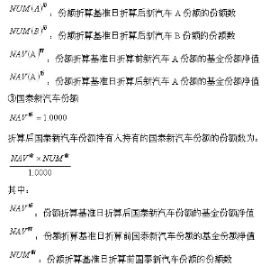 (上接B43版) 国证新能源汽车指数由深圳证券信息有限公司发布,以沪深A股市场属于整车、电池材料、上游材料、电机电控和充电桩等新能源产业链的上市公司为样本空间,根据市值和成交金额综合排名,选出50只股票作为指数样本股。国证新能源汽车指数可以反映新能源汽车产业的整体运行情况。 如果指数编制单位变更或停止标的指数的编制、发布或授权,或标的指数由其他指数替代、或由于指数编制方法的重大变更等事项导致本基金管理人认为标的指数不宜继续作为跟踪标的,或证券市场有其他代表性更强、更适合投资的指数推出时,本基金管理人可以依据维护投资人合法权益的原则,在履行适当程序后变更本基金的标的指数、业绩比较基准和基金名称。若变更标的指数、业绩比较基准对基金投资范围和投资策略无实质性影响(包括但不限于指数编制单位变更、指数更名等事项),则无需召开基金份额持有人大会,基金管理人应与基金托管人协商一致后,报中国证监会备案并及时公告。若变更业绩比较基准、标的指数涉及本基金投资范围或投资策略的实质性变更,则基金管理人应就变更业绩比较基准、标的指数召开基金份额持有人大会,并报中国证监会备案。 六、风险收益特征 本基金虽为股票型指数基金,但由于采取了基金份额分级的结构设计,不同的基金份额具有不同的风险收益特征。 运作过程中,本基金共有三类基金份额,分别为国泰新汽车份额、新汽车A份额、新汽车B份额。其中国泰新汽车份额为普通的股票型指数基金份额,具有较高预期风险、较高预期收益的特征,其预期风险和预期收益均高于混合型基金、债券型基金和货币市场基金;新汽车A份额的预期风险和预期收益较低;新汽车B份额采用了杠杆式的结构,预期风险和预期收益有所放大,将高于普通的股票型基金。 七、基金的融资融券 本基金可以根据届时有效的有关法律法规和政策的规定进行融资融券。 第十七部分 基金的财产 一、基金资产总值 基金资产总值是指购买的各类证券及票据价值、银行存款本息和基金应收的申购基金款以及其他投资所形成的价值总和。 二、基金资产净值 基金资产净值是指基金资产总值减去基金负债后的价值。 三、基金财产的账户 基金托管人根据相关法律法规、规范性文件为本基金开立资金账户、证券账户、期货账户以及投资所需的其他专用账户。开立的基金专用账户与基金管理人、基金托管人、基金销售机构和基金注册登记机构自有的财产账户以及其他基金财产账户相独立。 四、基金财产的保管和处分 本基金财产独立于基金管理人、基金托管人和基金销售机构的财产,并由基金托管人保管。基金管理人、基金托管人、基金注册登记机构和基金销售机构以其自有的财产承担其自身的法律责任,其债权人不得对本基金财产行使请求冻结、扣押或其他权利。除依法律法规和《基金合同》的规定处分外,基金财产不得被处分。 基金管理人、基金托管人因依法解散、被依法撤销或者被依法宣告破产等原因进行清算的,基金财产不属于其清算财产。基金管理人管理运作基金财产所产生的债权,不得与其固有资产产生的债务相互抵销;基金管理人管理运作不同基金的基金财产所产生的债权债务不得相互抵销。 第十八部分 基金资产估值 一、估值日 本基金的估值日为本基金相关的证券交易场所的交易日以及国家法律法规规定需要对外披露基金净值的非交易日。 二、估值对象 基金所拥有的股票、权证、债券和银行存款本息、应收款项、股指期货合约、其它投资等资产及负债。 三、估值方法 1、证券交易所上市的有价证券的估值 (1)交易所上市的有价证券(包括股票、权证等),以其估值日在证券交易所挂牌的市价(收盘价)估值;估值日无交易的,且最近交易日后经济环境未发生重大变化或证券发行机构未发生影响证券价格的重大事件的,以最近交易日的市价(收盘价)估值;如最近交易日后经济环境发生了重大变化或证券发行机构发生影响证券价格的重大事件的,可参考类似投资品种的现行市价及重大变化因素,调整最近交易市价,确定公允价格; (2)交易所上市实行净价交易的债券按估值日收盘价估值,估值日没有交易的,且最近交易日后经济环境未发生重大变化,按最近交易日的收盘价估值。如最近交易日后经济环境发生了重大变化的,可参考类似投资品种的现行市价及重大变化因素,调整最近交易市价,确定公允价格; (3)交易所上市未实行净价交易的债券按估值日收盘价减去债券收盘价中所含的债券应收利息得到的净价进行估值;估值日没有交易的,且最近交易日后经济环境未发生重大变化,按最近交易日债券收盘价减去债券收盘价中所含的债券应收利息得到的净价进行估值。如最近交易日后经济环境发生了重大变化的,可参考类似投资品种的现行市价及重大变化因素,调整最近交易市价,确定公允价格; (4)交易所上市不存在活跃市场的有价证券,采用估值技术确定公允价值。交易所上市的资产支持证券,采用估值技术确定公允价值,在估值技术难以可靠计量公允价值的情况下,按成本估值。 2、处于未上市期间的有价证券应区分如下情况处理: (1)送股、转增股、配股和公开增发的新股,按估值日在证券交易所挂牌的同一股票的估值方法估值;该日无交