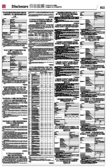 关于华安中证全指证券公司指数分级 证券投资基金不定期份额折算结果及 恢复交易的公告 根据《华安中证全指证券公司指数分级证券投资基金基金合同》(简称“基金合同”)及深圳证券交易所和中国证券登记结算有限责任公司的相关业务规定,华安基金管理有限公司(以下简称“本公司”)以2015年8月25日为基准日,对华安中证全指证券公司指数分级证券投资基金之基础份额(以下简称“华安中证证券份额”, 场内简称:“证券股基”,交易代码:160419)、华安中证全指证券公司指数分级证券投资基金之A份额(以下简称“华安中证证券A份额”,场内简称:“证券股A”,交易代码:150301)及华安中证全指证券公司指数分级证券投资基金B份额(以下简称“华安中证证券B份额”, 场内简称:“证券股B”,交易代码:150302)实施不定期份额折算,现将相关事项公告如下: 一、份额折算结果 2015年8月25日,华安中证证券份额的场外份额折算后的份额数采用截位法保留到小数点后两位,由此产生的误差计入基金财产;华安中证证券份额的场内份额经折算后的份额数、华安中证证券A份额新增份额折算成华安中证证券份额的场内份额取整计算(最小单位为1份),不足1份的零碎份,按各个零碎份从大到小的排序,依次向相应的基金份额持有人记增1份,直到所有零碎份的合计份额分配完毕。基金份额折算比例按截位法精确到小数点后第9位。具体结果如下表所示: ■ 注:场外华安中证证券份额经折算后产生新增的华安中证证券份额仍登记在场外;场内华安中证证券份额经折算后产生新增的华安中证证券份额仍登记在场内;华安中证证券A份额经折算后产生新增的华安中证证券份额登记在场内。 投资者自本公告发布之日起可查询经本基金注册登记人及本基金管理人确认的折算后份额。 二、恢复交易 自2015年8月27日起,本基金恢复申购、赎回、转托管(包括场外转托管和跨系统转托管)和配对转换业务,华安中证证券A份额、华安中证证券B份额将于2015年8月27日上午9:30—10:30停牌一小时后复牌。根据《深圳证券交易所证券投资基金交易和申购赎回实施细则》,2015年8月27日复牌首日华安中证证券A份额、华安中证证券B份额即时行情显示的前收盘价为2015年8月26日的华安中证证券A份额、华安中证证券B份额的基金份额参考净值(四舍五入至0.001元), 分别为1.000元和0.977元。2015年8月27日当日华安中证证券A份额、华安中证证券B份额均可能出现交易价格大幅波动的情形。敬请投资者注意投资风险。 三、重要提示 1、本基金华安中证证券A份额具有预期风险、预期收益较低的特征,但在不定期份额折算后华安中证证券A份额持有人的风险收益特征将发生较大变化,由持有单一的较低风险收益特征的华安中证证券A份额变为同时持有较低风险收益特征的华安中证证券A份额与较高风险收益特征的华安中证证券份额,因此原华安中证证券A份额持有人预期收益实现的不确定性将会增加;此外,华安中证证券份额为跟踪指数的基础份额,其份额净值将随市场涨跌而变化,因此原华安中证证券A份额持有人预期收益的实现存在一定的不确定性,还可能会承担因市场下跌而遭受损失的风险。 2、本基金华安中证证券B份额表现为高风险、高预期收益的特征,不定期份额折算后其杠杆倍数将大幅降低,将恢复到初始杠杆水平,相应地,华安中证证券B份额参考净值随市场涨跌而增长或者下降的幅度也会大幅减小。 3、由于华安中证证券A份额、华安中证证券B份额折算前可能存在折溢价交易情形,不定期份额折算后,华安中证证券A份额、华安中证证券B份额的折溢价率可能发生较大变化。特提请参与二级市场交易的投资者注意折溢价所带来的风险。 4、原华安中证证券A份额、华安中证证券份额持有人可通过办理配对转换业务将此次折算获得的场内华安中证证券份额分拆为华安中证证券A份额、华安中证证券B份额。 5、根据深圳证券交易所的相关业务规则,华安中证证券A份额、华安中证证券B份额、华安中证证券份额的场内份额经折算后的份额数均取整计算(最小单位为1份),不足1份的零碎份,按各个零碎份从大到小的排序,依次向相应的基金份额持有人记增1份,直到所有零碎份的合计份额分配完毕。持有极小数量华安中证证券A份额、华安中证证券B份额、华安中证证券份额的持有人,存在折算后份额因为不足1份而导致相应的资产被强制归入基金资产的风险。 6、投资者若希望了解基金份额折算业务详情,请拨打本公司客户服务电话40088-50099或登录本公司网站(www.huaan.com.cn)获取相关信息。 风险提示: 本基金管理人承诺以诚实信用、勤勉尽责的原则管理和运用基金资产,但不保证基金一定盈利,也不保证最低收益。投资者投资基金时应认真阅读基金合同和招募说明书。敬请投资者留意投资风险。 特此公告。 华安基金管理有限公司 2015年8月27日