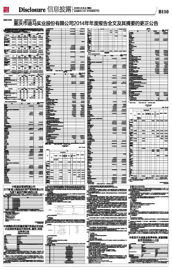 本公司及董事会全体成员保证公告内容不存在虚假记载、误导性陈述或者重大遗漏,并对其内容的真实、准确和完整承担个别及连带责任。 根据中国证券监督管理委员会重庆监管局《关于对重庆市迪马实业股份有限公司采取责令改正措施的决定》【2015】9号,公司对2014年财务数据进行会计差错更正,具体更正内容请详见《关于会计差错更正暨调整2015年半年报期初数及上年同期数的公告》(临2015-080号)。针对上述财务数据更正,公司现对2014年3月4日在上海证券交易所网站(http://www.sse.com.cn)上披露的公司2014年年度报告(以下简称“原年报”)全文及其摘要中所涉内容进行相应更正及调整。主要更正调整内容如下: 一、原年报全文“第三节 会计数据和财务指标摘要”之“一、(一)主要会计数据”披露为: 单位:元 币种:人民币 ■ 现更正为: 单位:元 币种:人民币 ■ 二、原年报全文“第三节 会计数据和财务指标摘要”之“一、(二)主要财务指标”披露为: 单位:元 币种:人民币 ■ 现更正为: 单位:元 币种:人民币 ■ 三、原年报全文“第十一节 财务报告”之“二、财务报表”披露为: 合并资产负债表 2014年12月31日 编制单位: 重庆市迪马实业股份有限公司 单位:元 币种:人民币 ■ ■ 法定代表人:向志鹏 主管会计工作负责人:易琳 会计机构负责人:张成钢 合并利润表 2014年1—12月 单位:元 币种:人民币 ■ 本期发生同一控制下企业合并的,被合并方在合并前实现的净利润为:16,256,831.35 元, 上期被合并方实现的净利润为: 257,414,596.55 元。法定代表人:向志鹏 主管会计工作负责人:易琳 会计机构负责人:张成钢
