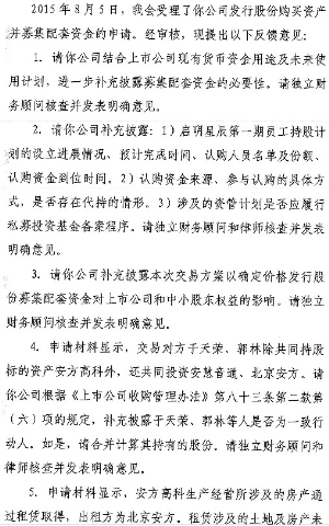 启明星辰信息技术集团股份有限公司关于 收到《中国证监会行政许可项目审查一次反馈意见通知书》的公告 证券代码:002439 证券简称:启明星辰 公告编号:2015-072 启明星辰信息技术集团股份有限公司关于 收到《中国证监会行政许可项目审查一次反馈意见通知书》的公告 本公司及董事会全体成员保证公告内容真实、准确和完整,并对公告中的虚假记载、误导性陈述或重大遗漏承担责任。 启明星辰信息技术集团股份有限公司(以下简称"公司")于2015年8月27日收到中国证券监督管理委员会(以下简称"中国证监会")出具的《中国证监会行政许可项目审查一次反馈意见通知书》(152421号)。中国证监会依法对公司提交的《启明星辰信息技术集团股份有限公司发行股份购买资产核准》行政许可申请材料进行了审查,现需要公司就有关问题作出书面说明和解释,并在30个工作日内向中国证监会行政许可受理部门提交书面回复意见。 公司与相关中介机构将按照上述通知书的要求及时组织有关材料,在规定的期限内将书面回复意见报送至中国证监会行政许可受理部门。公司本次发行股份购买资产事项尚需获得中国证监会核准,公司将根据中国证监会审批的进展情况,及时履行信息披露义务。敬请广大投资者注意投资风险。 特此公告。 附件:《中国证监会行政许可项目审查一次反馈意见通知书》(152421号) 启明星辰信息技术集团股份有限公司 董事会 2015年8月28日
