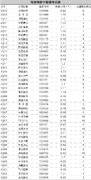 马信琪41股操盘实录看超级牛散如何“捉妖股” 证券时报记者 李雪峰 张骞爻 9月11日,证监会披露了两起股价操纵案,涉事人之一马信琪便是被民间称为“超短F4”成员的马信琪,另一名涉事人则是号称中信证券上海溧阳路营业部“孙哥”的孙国栋。 相比于市场上那些众所周知的航母级私募、游资巨鳄,马信琪、孙国栋显然还属于能量有限的游资,未必有能力操纵市场。由于出身草莽,见证过中国资本市场初期的腥风血雨,马信琪、孙国栋身上的江湖气息更为浓厚,市场感觉和操盘技巧亦非一般散户所能企及。 操作手法短平快 有人的地方就有江湖,有股票的地方可能也无法彻底避免操纵。回溯马信琪的操作记录,短平快系其主要特色,几乎任何一只股票,马信琪持股周期均不超过一个季度;只有一种情况,那就是被套牢,马信琪这时才会适当延长持股周期,直至解套出货。 据不完全统计,从2005年开始,马信琪至少以其本人名义直接进入约41家上市公司前十大流通股东之列。目前,马信琪仅持有太平洋1.75%股权(据2015年中报),系其第五大流通股东。此外,根据用友网络8月25日披露的增发报告书显示,马信琪在7~8月份已悄然进入用友网络前十大股东之列,持股0.82%,系用友网络第八大股东。 相关公司股东资料显示,马信琪是不折不扣的牛散,经常以唯一自然人股东的身份出现在上市公司前十大股东或前十大流通股东之列。例如用友网络截至8月下旬的前十大股东均是产业资本、基金或险资等机构,仅有马信琪系自然人。 同样的情况在其他上市公司中也经常出现,如太平洋2015年中报披露的前十大流通股东中,马信琪也是唯一的自然人股东。尽管马信琪持股比例较低,不足以对所持有的上市公司形成实质性影响,但基于其牛散身份,很多中小投资者亦会表示关注。 再如2014年一季度,马信琪出现在东方航空前十大流通股东之列,持股0.15%,东方航空九大其他流通股东普遍是东方航空集团、外运发展、锦江国际集团等央企或地方国资。 当然,马信琪偶尔也会出现在散户扎堆的上市公司中。如宏昌电子2013年一季报披露的前十大流通股东均为自然人,马信琪便是其中之一,持股0.16%,系第九大流通股股东。*ST沪科也一度散户扎堆,该公司2007年一季度前十大流通股东也均为自然人,马信琪持股0.15%,系*ST沪科彼时第十大流通股东。 历数马信琪2005年以来的持股情况,除深振业A、中金岭南、中南建投、珠江实业、国投新集外,其余几乎所有公司持股周期均为一年。即便是前述深振业A、中金岭南等5家公司,持股周期也普遍在半年之内。如中南建投2014年一季报显示,马信琪是第三大流通股东(持股1.53%),2014年第二季度,马信琪依然位列中南建投前十大流通股东之列,持股降至1.03%;而在中南建投2014年三季报中,马信琪从前十大流通股东中消失。 举牌深振业A 唯一的个案实际上就是深振业A,2010年第三季度,马信琪首次进入深振业A前十大流通股东之列,且持股比例达到3.73%,远超马信琪在其他上市公司中0.1%~0.5%的持股比例。在接下来的数个季度中,马信琪不断增持深振业A,直至2013年6月份,马信琪触发举牌红线,持股比例达到5%,这是马信琪迄今为止首次亦是唯一一次在二级市场举牌上市公司。 举牌深振业A之后,马信琪并未进一步增持,而是从2014年第二季度开始减持深振业A。今年一季报中,马信琪尚持有深振业A0.6%股权,而在中报中,他从深振业A前十大流通股中消失,意味着今年第二季度减持殆尽。 颇有意思的是,在马信琪2013年6月份举牌深振业A之后,业界曾给予诸多解读。因为彼时深圳国资委正与姚振华、姚建辉控制的“宝能系”就深振业A控股权酣战正凶,市场曾猜测马信琪或会与姚氏兄弟形成心有灵犀式的同步增持,若如此,深圳国资委死守深振业A控股权的难度便会增大。 以现在的视角重新审视上述举牌事件,不难发现,市场的猜测并无根据,所谓深振业A控股权旁落的担忧略显多余。自始至终,马信琪都是牛散,不以攫取上市公司控股权为目的,也无意参与实业经营。据知情人士透露,马信琪举牌深振业A的目的其实很简单,就是举牌前被套,或者浮盈较少,后来不断增持触及举牌红线,解套之后迅速清空深振业A。 事实上,在举牌深振业A后,马信琪并未举牌第二家公司,依然扮演民间给予的牛散角色。2015年7月31日,马信琪一如既往地操作暴风科技,但最终因为“多次大笔申报买入后快速撤单,以不成交或少量成交的方式拉抬暴风科技股价,随后快速反向卖出之前持有的部分股票获利”而被监管层处罚。 记者从多个层面了解到,上述操作方式并非马信琪所专有,市场上很多操盘手或多或少都会利用这种方式操盘。例如,投资者可能会经常发现某公司股票买一席位突然出现巨量买单,即俗称的垫单现象,客观上会营造一种买盘很积极的氛围,此时其他主动型买盘会以较高的价位扫货,促成股价上涨。有些时候,由于股票价格快速上扬,原买一的巨量挂单因未买到股票而会被动撤掉;当然,还有可能就是这种巨量买单原本就不是为了买股票,仅仅是为了营造买盘氛围,这就涉嫌操纵股价。 涉嫌操纵暴风科技 按照监管层的处罚理由,马信琪便是涉嫌操纵暴风科技股价。不过,如何区分善意的撤单与恶意操纵股价需要仔细甄别,有市场分析人士认为,不排除马信琪是“被枪打的出头鸟”,其他以类似方式操纵股价的牛散也不在少数,