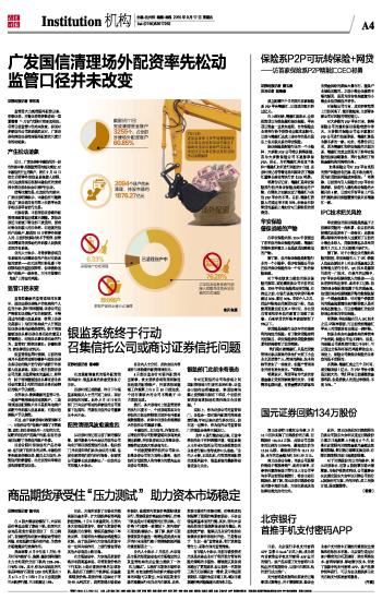 广发国信清理场外配资率先松动监管口径并未改变 证券时报记者 李东亮 监管层大力规范场外配资以来,华泰证券、齐鲁证券等多数券商一直紧绷着“一刀切”式限时清理这根弦。尽管目前监管口径尚未改变,但面对多家信托公司发函强烈反对,广发证券和国信证券清理场外配资的尺度已有松动迹象。 产生松动迹象 近日,广发证券给中融信托的一份告知函中称,根据监管层的相关规定,对中融信托开立的账户,将在9月18日收市后暂停外部信息系统接入权限,并在完成清理后根据中融信托的请求报中国证券业协会申请评估认证。 值得注意的是,在这份告知函中,广发证券明确表示,中融信托可继续通过广发证券自有的网上交易平台及手机证券平台进行交易。 无独有偶,日前国信证券场外配资清理政策也出现重大调整。国信证券近日给旗下营业部下发通知,要求对营业部接入的非伞形、非违规的信托产品账户,原通知18日暂停外部接入的,目前研究探讨先不予暂停,但营业部需要尽快推动把外部接入切换到总部自有系统。 业内人士表示,尽管多数券商自有系统尚无法满足信托产品对交易系统的要求——如无法同时给私募下单权限和信托监控权限等,但毕竟给这些产品账户一线生机,而不用冒着在“地板”上清仓的风险。 监管口径未变 监管层最新的监管通报再次重申,违法出借证券账户的机构和个人应当主动、及时清理整顿;证券公司应严格落实证券账户实名制要求,不得通过外部接入信息系统(含网上证券交易接口)为任何机构或个人开展违法证券业务活动提供便利。《关于清理整顿违法从事证券业务活动的意见》明确提出,对违法从事证券活动的行为,监管部门将依法查处;涉嫌犯罪的,依法移送公安机关。 但监管层也同时强调,目前的清理并不是简单地将涉嫌参与违法证券业务活动的账户进行销户或断开外部接入信息系统。实际上是在前期证券公司自查、证监局核实的基础上,将符合《关于清理整顿违法从事证券业务活动的意见》列明的违法业务活动特征的账户予以规范。 业界表示,按照最新的监管口径,一是要严格清理违法违规账户,二是清理违法配资账户并不是简单地销户或断开外部接入信息系统,而是对违规账户予以规范。 不过,由于各家券商对政策理解不一,对信托公司产品账户采取了不同政策。诸如,部分券商采用一刀切的方式,切断所有信托产品账户外接,但有的券商仅切断了伞形信托账户外接。 证券业限时清理信托产品的举动,也引发了信托业的反弹。中融信托率先致函华泰证券,随后北方信托、外贸信托陆续登场,亦分别指向华泰证券和国泰君安证券。 官兵/制图 本版导读: