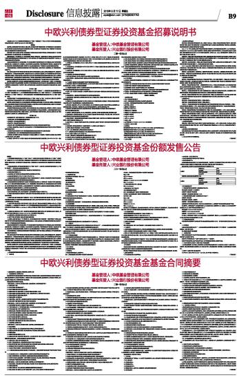 基金管理人:中欧基金管理有限公司 基金托管人:兴业银行股份有限公司 二零一五年九月 本基金经2015年7月24日中国证券监督管理委员会(以下简称“中国证监会”)下发的《关于准予中欧兴利债券型证券投资基金注册的批复》(证监许可[2015]1787号文)准予募集注册。 重要提示 基金管理人保证招募说明书的内容真实、准确、完整。本招募说明书经中国证监会注册,但中国证监会对本基金募集的注册,并不表明其对本基金的价值和收益作出实质性判断或保证,也不表明投资于本基金没有风险。中国证监会不对基金的投资价值及市场前景等作出实质性判断或者保证。 投资有风险,投资人在认购(或申购)本基金前应认真阅读本基金的招募说明书和基金合同等信息披露文件,自主判断基金的投资价值,自主做出投资决策,自行承担投资风险。 证券投资基金是一种长期投资工具,其主要功能是分散投资,降低投资单一证券所带来的个别风险。基金投资不同于银行储蓄和债券等能够提供固定收益预期的金融工具,投资人购买基金,既可能按其持有份额分享基金投资所产生的收益,也可能承担基金投资所带来的损失。 本基金的投资范围包括中小企业私募债券。中小企业私募债券存在因市场交易量不足而不能迅速、低成本地转变为现金的流动性风险,以及债券的发行人出现违约、无法支付到期本息的信用风险,可能影响基金资产变现能力,造成基金资产损失。本基金管理人将秉承稳健投资的原则,审慎参与中小企业私募债券的投资,严格控制中小企业私募债券的投资风险。 本基金为债券型基金,其预期收益及预期风险水平高于货币市场基金,但低于混合型、股票型基金,属于较低预期风险/收益的产品。 投资人购买本基金并不等于将资金作为存款存放在银行或存款类金融机构。投资人应当认真阅读基金合同、招募说明书等基金法律文件,了解基金的风险收益特征,根据自身的投资目的、投资期限、投资经验、资产状况等判断基金是否和自身的风险承受能力相适应,并通过基金管理人或基金管理人委托的具有基金销售业务资格的其他机构购买基金。投资人在获得基金投资收益的同时,亦承担基金投资中出现的各类风险,可能包括:证券市场整体环境引发的系统性风险、个别证券特有的非系统性风险、大量赎回或暴跌导致的流动性风险、基金管理人在投资经营过程中产生的操作风险以及本基金特有风险等。 基金管理人依照恪尽职守、诚实信用、谨慎勤勉的原则管理和运用基金资产,但不保证本基金一定盈利,也不保证最低收益。基金的过往业绩并不预示其未来表现,基金管理人管理的其他基金的业绩并不构成对本基金业绩表现的保证。基金管理人提醒投资人注意基金投资的“买者自负”原则,在作出投资决策后,基金运营状况与基金净值变化引致的投资风险,由投资人自行负担。 第一部分 绪言 本招募说明书依据《中华人民共和国证券投资基金法》(以下简称“《基金法》”)、《证券投资基金信息披露管理办法》(以下简称“《信息披露办法》”)、《公开募集证券投资基金运作管理办法》(以下简称“《运作办法》”)、《证券投资基金销售管理办法》(以下简称“《销售办法》”)等有关法律法规及《中欧兴利债券型证券投资基金基金合同》(以下简称“基金合同”)编写。 本招募说明书阐述了中欧兴利债券型证券投资基金(以下简称“本基金”或“基金”)的投资目标、策略、风险、费率等与投资人投资决策有关的全部必要事项,投资人在做出投资决策前应仔细阅读本招募说明书。 基金管理人承诺本招募说明书不存在任何虚假记载、误导性陈述或者重大遗漏,并对其真实性、准确性、完整性承担法律责任。本基金是根据本招募说明书所载明的资料申请募集的。本基金管理人没有委托或授权任何其他人提供未在本招募说明书中载明的信息,或对本招募说明书做出任何解释或者说明。 本招募说明书根据本基金的基金合同编写,并经中国证监会注册。基金合同是约定基金合同当事人之间权利、义务的法律文件。基金投资人自依基金合同取得基金份额,即成为基金份额持有人和基金合同的当事人,其持有基金份额的行为本身即表明其对基金合同的承认和接受,并按照《基金法》、基金合同及其他有关规定享有权利、承担义务。基金投资人欲了解基金份额持有人的权利和义务,应详细查阅基金合同。 第二部分 释义 在本招募说明书中,除非文意另有所指,下列词语或简称具有如下含义: 1、基金或本基金:指中欧兴利债券型证券投资基金 2、基金管理人:指中欧基金管理有限公司 3、基金托管人:指兴业银行股份有限公司 4、基金合同:指《中欧兴利债券型证券投资基金基金合同》及对基金合同的任何有效修订和补充 5、托管协议:指基金管理人与基金托管人就本基金签订之《中欧兴利债券型证券投资基金托管协议》及对该托管协议的任何有效修订和补充 6、招募说明书或本招募说明书:指《中欧兴利债券型证券投资基金招募说明书》及其定期的更新 7、基金份额发售公告:指《中欧兴利债券型证券投资基金基金份额发售公告》 8、法律法规:指中国现行有效并公布实施的法律、行政法规、规范性文件、司法解释、行政规章以及其他对基金合同当事人有约束力的决定、决议、