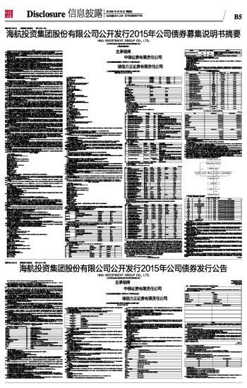 发行人及董事会全体成员保证公告内容的真实、准确和完整,对公告的虚假记载、误导性陈述或者重大遗漏负连带责任。 重 要 提 示 1、中国证券监督管理委员会于2015年9月23日以“证监许可[2015]2181号”文核准海航投资集团股份有限公司(以下简称“发行人”、“公司”或“海航投资”)面向合格投资者公开发行总额不超过16亿元的公司债券(以下简称“本次债券”)。 2、本次债券拟发行面值为160,000万元,每张面值为人民币100元,共计1,600万张,发行价格为100元/张。 3、根据《公司债管理办法》第十八条规定,本次债券不符合该条款中可以面向公众投资者和合格投资者同时发行的条件,仅面向合格投资者发行,公众投资者不得参与发行认购。本次债券上市后将被实施投资者适当性管理,仅限合格投资者参与交易,公众投资者认购或买入的交易行为无效。 4、发行人主体评级为AA,债券评级为AA+,发行规模为16亿元。发行人截至2014年12月31日的净资产为42.39亿元,本次债券发行后公司累计债券余额为16亿元,不超过公司净资产的40%;本次债券发行前,发行人最近三个会计年度实现的年均可分配利润为2.42亿元(2012年、2013年和2014年经审计合并财务报表中归属于母公司所有者的净利润的平均值),预计不少于本次债券一年利息的1.5倍。截至2014年12月31日,发行人合并报表口径资产负债率为50.79%,母公司资产负债率为23.87%,均不高于75%。发行人在本次发行前的财务指标符合相关规定。 5、发行人截至2015年6月30日的净资产为43.25亿元,本次债券发行后公司累计债券余额为16亿元,不超过公司净资产的40%。截至2015年6月30日,公司合并报表口径资产负债率为48.77%,母公司口径资产负债率为26.96%,均不高于75%。发行人在本次发行前的财务指标符合相关规定。 6、公司将在本次债券发行结束后及时向深圳证券交易所提出上市交易申请,并将申请在深圳证券交易所集中竞价系统和综合协议交易平台同时挂牌(以下简称“双边挂牌”)。目前本次债券符合在深圳证券交易所双边挂牌的上市条件,但本次债券上市前,公司财务状况、经营业绩、现金流和信用评级等情况可能出现重大变化,公司无法保证本次债券双边挂牌的上市申请能够获得深圳证券交易所同意,若届时本次债券无法进行双边挂牌上市,投资者有权选择在上市前将本次债券回售予本公司。因公司经营与收益等情况变化引致的投资风险和流动性风险,由债券投资者自行承担。本次债券不在除深圳证券交易所以外的其它交易场所上市。 7、海航集团有限公司为本次债券的还本付息出具了担保函,担保人承担保证的方式为全额无条件不可撤销的连带责任保证担保,担保范围包括本次债券的本金、利息、违约金、损害赔偿金和实现债权的全部费用。 8、本次债券期限为3年期。 9、本次债券票面利率询价区间为4.00%-6.50%。发行人和主承销商将于2015年10月19日(T-1日)向网下机构投资者进行利率询价,并根据网下询价情况在上述利率询价区间内协商确定本次债券各品种最终的票面利率。发行人和主承销商将于2015年10月20日(T日)在深圳证券交易所网站(http://www.szse.cn)及巨潮资讯网(http://www.cninfo.com.cn)上公告本次债券各品种的最终票面利率,敬请投资者关注。 10、本次债券发行采取网下面向符合《公司债管理办法》等相关规定的合格投资者询价配售的方式。网下申购由发行人与主承销商根据询价情况进行配售,配售原则详见本公告“三、网下发行”中的“(六)配售”。具体发行安排将根据深圳证券交易所的相关规定进行。 本次债券发行对象为符合《公司债管理办法》规定并持有中国结算深圳分公司开立的A股证券账户的合格投资者(国家法律、法规禁止购买者除外)。 11、本次债券简称为“15海投债”,债券代码为“112287”。网下发行仅面向合格投资者。合格投资者通过向簿记管理人提交《网下利率询价及申购申请表》的方式参与网下询价申购,合格投资者网下最低申购单位为1,000手(100万元),超过1,000手的必须是1,000手(100万元)的整数倍,主承销商另有规定的除外。 12、投资者不得非法利用他人账户或资金进行申购,也不得违规融资或替他人违规融资申购。投资者申购并持有本次债券应遵守相关法律法规和中国证券监督管理委员会的有关规定,并自行承担相应的法律责任。 13、敬请投资者注意本公告中本次债券的发行方式、发行对象、发行数量、发行时间、认购办法、认购程序、认购价格和认购款缴纳等具体规定。 14、发行人主体信用等级为AA,本次债券信用等级为AA+,本次债券符合进行质押式回购交易的基本条件。本次债券质押式回购相关申请尚需相关部门批准,具体折算率等事宜按中国证券登记结算有限责任公司的相关规定执行。 15、发行人将在本次债券发行结束后尽快办理有关上市手续,本次债券具体上市时间另行公告。 16、本公告仅对本次债券发行的有关事宜进行说明,不构成针对本次债券的任何投资建议。投资者欲详细了解本次债券情况,请仔细阅读《海航投资集团股份有限公司公开发行2015年公司债券募集说明书(面向合格投资者)》,本次债券募集说明书摘要已刊登在2015年10月16日(T-2日)的《中国证券报》、《上海证券报》、《证券时报》、《证券日报》上,有关本次发行的相关资料,投资者亦可到深圳证券交易所网站(http:// www.s