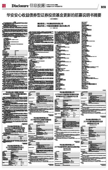(下转B59版) 重要提示 华安安心收益债券型证券投资基金(以下简称“本基金”)由华安基金管理有限公司(以下简称“基金管理人”)依照有关法律法规进行募集,并经中国证券监督管理委员会2012年7月23日证监许可[2012]951号文核准。本基金基金合同自2012年9月7日正式生效。 本基金管理人保证招募说明书的内容真实、准确、完整。 本招募说明书经中国证监会核准,但中国证监会对本基金募集的核准,并不表明其对本基金的价值和收益作出实质性判断或保证,也不表明投资于本基金没有风险。 投资有风险。投资者应当认真阅读《基金合同》、《招募说明书》等基金法律文件,了解基金的风险收益特征,并根据自身的投资目的、投资期限、投资经验、资产状况等判断基金是否和投资者的风险承受能力相适应。 本摘要根据基金合同和基金招募说明书编写,并经中国证监会核准。基金合同是约定基金当事人之间权利、义务的法律文件。基金投资人自依基金合同取得基金份额,即成为基金份额持有人和本基金合同的当事人,其持有基金份额的行为本身即表明其对基金合同的承认和接受,并按照《基金法》、《运作办法》、基金合同及其他有关规定享有权利、承担义务。基金投资人欲了解基金份额持有人的权利和义务,应详细查阅基金合同。 基金管理人依照恪尽职守、诚实信用、谨慎勤勉的原则管理和运用基金资产,但不保证本基金一定盈利,也不保证最低收益。本基金的过往业绩及其净值高低并不预示其未来业绩表现(或“基金管理人管理的其他基金的业绩不构成对本基金业绩表现的保证”)。基金管理人提醒投资者基金投资的“买者自负”原则,在作出投资决策后,基金运营状况与基金净值变化引致的投资风险,由投资者自行负担。 本招募说明书摘要中涉及与基金托管人相关的基金信息已经与基金托管人复核。除特别说明外,本招募说明书摘要所载内容截止日为2015年9月7日,有关财务数据和净值表现截止日为2015年6月30日。 一、基金管理人 (一)基金管理人概况 1、名称:华安基金管理有限公司 2、住所:上海浦东新区世纪大道8号,上海国金中心二期31、32层 3、法定代表人:朱学华 4、设立日期:1998年6月4日 5、批准设立机关及批准设立文号:中国证监会证监基字[1998]20号 6、注册资本:1.5亿元人民币 7、组织形式:有限责任公司 8、经营范围:从事基金管理业务、发起设立基金以及从事中国证监会批准的其他业务 9、存续期间:持续经营 10、联系电话:(021)38969999 11、客户服务电话:40088-50099 12、联系人:王艳 13、网址:www.huaan.com.cn (二)注册资本和股权结构 1、注册资本:1.5亿元人民币 2、股权结构 ■ (三)主要人员情况 1、基金管理人董事、监事、经理及其他高级管理人员的姓名、从业简历、学历及兼职情况等。 (1)董事会 朱学华先生,大专学历。历任上海证券有限责任公司党委书记、副董事长、副总经理并兼任海际大和证券有限责任公司董事长,现任华安基金管理有限公司董事长、法定代表人,党总支书记。 童威先生,博士研究生学历,14年证券、基金从业经验。曾任上海证券有限责任公司研究发展中心部门总经理,上海国际集团有限公司研究发展总部副总经理(主持工作),上投摩根基金管理有限责任公司副总经理,上海国际集团有限公司战略发展总部总经理,自2015年7月起任华安基金管理有限公司总经理。 冯祖新先生,研究生学历。历任上海市经济委员会信息中心副主任、主任,上海市工业投资公司副总经理、总经理,上海工业投资(集团)有限公司副总裁、党委副书记。现任上海工业投资(集团)有限公司执行董事(法定代表人)、总裁、党委书记。 马名驹先生,工商管理硕士,高级会计师。历任凤凰股份有限公司副董事长、总经理,上海东方上市企业博览中心副总经理。现任锦江国际(集团)有限公司副总裁兼计划财务部经理及金融事业部总经理、上海锦江国际投资管理有限公司董事长兼总经理、锦江麦德龙现购自运有限公司副董事长、长江养老保险股份有限公司董事、史带财产保险股份有限公司监事、上海国际信托有限公司监事。 董鑑华先生,大学学历,高级经济师。历任上海市审计局固定资产投资科员、副处长、处长,上海市审计局财政审计处处长,现任上海电气(集团)总公司财务总监。 王松先生,研究生学历,高级经济师。历任建设银行总行投资部职员,国泰证券有限公司北京办事处副主任、发行二部副总经理、债券部总经理,国泰君安证券股份有限公司债券业务一部总经理、固定收益证券总部总经理、固定收益证券总部总监、总裁助理,现任国泰君安证券股份有限公司副总裁。 独立董事: 萧灼基先生,研究生学历,教授。历任全国政协委员,政协经济委员会委员,北京大学经济学院教授,博士生导师,北京市、云南省、吉林省、成都市、武汉市等省市专家顾问,北京市场经济研究所所长,《经济界》杂志社社长、主编。 吴伯庆先生,大学学历,一级律师,曾被评为上海市优秀律师与上海市十佳法律顾问。历任上海市城市建设局秘书科长、上海市第一律师事务所副主任、上海市金茂律师事务所主任、上海市律师协会副会长。现任上海市金茂律师事务所高级合伙人。 夏大慰先生,研究生学历,教授。现任上海国家会计学院学术委员会主任、教授、博士生导师,中国工业经济学