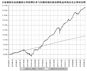 基金管理人:万家基金管理有限公司 基金托管人:华夏银行股份有限公司 报告送出日期:2015年10月26日 §1 重要提示 基金管理人的董事会及董事保证本报告所载资料不存在虚假记载、误导性陈述或重大遗漏,并对其内容的真实性、准确性和完整性承担个别及连带责任。 基金托管人华夏银行股份有限公司根据本基金合同规定,于2015年10月22日复核了本报告中的财务指标、净值表现和投资组合报告等内容,保证复核内容不存在虚假记载、误导性陈述或者重大遗漏。 基金管理人承诺以诚实信用、勤勉尽责的原则管理和运用基金资产,但不保证基金一定盈利。 基金的过往业绩并不代表其未来表现。投资有风险,投资者在作出投资决策前应仔细阅读本基金的招募说明书。 本报告中财务资料未经审计。 本报告期自2015年7月1日起至9月30日止。 §2 基金产品概况 ■ §3 主要财务指标和基金净值表现 3.1 主要财务指标 单位:人民币元 ■ 注:1、本期已实现收益指基金本期利息收入、投资收益、其他收入(不含公允价值变动收益)扣除相关费用后的余额,本期利润为本期已实现收益加上本期公允价值变动收益。 2、上述基金业绩指标不包括持有人交易基金的各项费用,计入费用后实际收益水平要低于所列数字。 3.2 基金净值表现 3.2.1 本报告期基金份额净值增长率及其与同期业绩比较基准收益率的比较 ■ 3.2.2 自基金合同生效以来基金累计净值增长率变动及其与同期业绩比较基准收益率变动的比较 ■ 注:本基金合同生效日期为2013年5月7日,建仓期为6个月,建仓期结束时各项资产配置比例符合基金合同要求。报告期末各项资产配置比例符合基金合同要求。 §4 管理人报告 4.1 基金经理(或基金经理小组)简介 ■ 注:1、任职日期以公告为准。 2、证券从业的含义遵从行业协会《证券业从业人员资格管理办法》的相关规定。 4.2 管理人对报告期内本基金运作遵规守信情况的说明 本报告期内,本基金管理人严格遵守基金合同、《证券投资基金法》、《公开募集证券投资基金运作管理办法》等法律、法规和监管部门的相关规定,依照诚实信用、勤勉尽责、安全高效的原则管理和运用基金资产,在认真控制投资风险的基础上,为基金持有人谋取最大利益,没有损害基金持有人利益的行为。 4.3 公平交易专项说明 4.3.1 公平交易制度的执行情况 根据中国证监会颁布的《证券投资基金管理公司公平交易制度指导意见》,公司制定了《公平交易管理办法》和《异常交易监控及报告管理办法》等规章制度,涵盖了研究、授权、投资决策和交易执行等投资管理活动的各个环节,确保公平对待不同投资组合,防范导致不公平交易以及利益输送的异常交易发生。 公司制订了明确的投资授权制度,并建立了统一的投资管理平台,确保不同投资组合获得公平的投资决策机会。实行集中交易制度,对于交易所公开竞价交易,执行交易系统中的公平交易程序;对于债券一级市场申购、非公开发行股票申购等非集中竞价交易,按照价格优先、比例分配的原则对交易结果进行分配;对于银行间交易,按照时间优先、价格优先的原则公平公正的进行询价并完成交易。为保证公平交易原则的实现,通过制度规范、流程审批、系统风控参数设置等进行事前控制,通过对投资交易系统的实时监控进行事中控制,通过对异常交易的监控和分析实现事后控制。 4.3.2 异常交易行为的专项说明 本报告期内未发现本基金有可能导致不公平交易和利益输送的异常交易。 本报告期内无下列情况:所有投资组合参与的交易所公开竞价同日反向交易成交较少的单边交易量超过该证券当日成交量的5%。 4.4 报告期内基金的投资策略和业绩表现说明 4.4.1 报告期内基金投资策略和运作分析 三季度,通胀一直处于低位,基本面数据也没有起色。货币政策上,央行还是一直维持了总量的宽松,但边际上是否会更宽则有待观察。A股股灾后,证监会一方面暂停了新股,另一方面开始清理二级市场股票杠杆,导致两融等资产大大减少,这都使得市场上理财资金无资产可配,纷纷涌入固定收益纯债市场,导致收益率不断下降,创下了近年来新低。 本基金在兼顾流动性的同时,根据大类资产配置灵活调整各类资产比例,抓住了纯债和权益的投资机会,获得了一定的绝对收益。 4.4.2 报告期内基金的业绩表现 截至报告期末,本基金份额净值为1.0758元,本报告期份额净值增长率为2.51%,业绩比较基准收益率为0.79%。 4.5 管理人对宏观经济、证券市场及行业走势的简要展望 货币政策继续放松,叠加目前市场资金泛滥无处可投的现状,债券市场依然面临着有利的环境。但是美元加息预期以及人民币贬值带来的资本流出压力,对国内资金面造成负面影响,边际上资金面是否会更加宽松存在变数。 本基金还是基于大类资产配置的原则,在管理好流动性的同时,灵活操作,努力为持有人获得良好回报。 4.6 报告期内基金持有人数或基金资产净值预警说明 本报告期内,本基金没有出现连续二十个工作日基金份额持有人数量不满二百人或者基金资产净值低于五千万元情况。 §5 投资组合报告 5.1 报告期末基金资产组合情况 ■ 5.2 报告期末按行业分类的股票投资组合 本基金本报告期末未持有股票。 5.3 报告期末按公允价值占基金资产净值比例大小排序的前十名股票投资明细 本基金本报