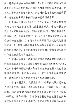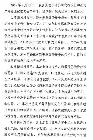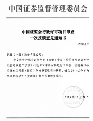 凯撒(中国)股份有限公司(以下简称"公司") 于2015年10月30日收到《中国证监会行政许可项目审查一次反馈意见通知书》(152904号)(详见附件),中国证监会依法对本公司提交的《凯撒(中国)股份有限公司发行股份购买资产核准》行政许可申请材料进行了审查,现需要公司就相关问题进行书面说明和解释,并在30个工作日内向中国证监会行政许可受理部门提交书面回复意见。