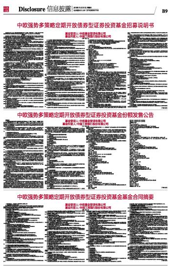 本基金经2015年9月25日中国证券监督管理委员会(以下简称“中国证监会”)下发的《关于准予中欧强势多策略定期开放债券型证券投资基金注册的批复》(证监许可[2015]2201号文)准予募集注册。 重要提示 基金管理人保证招募说明书的内容真实、准确、完整。本招募说明书经中国证监会注册,但中国证监会对本基金募集的注册,并不表明其对本基金的价值和收益作出实质性判断或保证,也不表明投资于本基金没有风险。中国证监会不对基金的投资价值及市场前景等作出实质性判断或者保证。 投资有风险,投资人在认购(或申购)本基金前应认真阅读本基金的招募说明书和基金合同等信息披露文件,自主判断基金的投资价值,自主做出投资决策,自行承担投资风险。 证券投资基金是一种长期投资工具,其主要功能是分散投资,降低投资单一证券所带来的个别风险。基金投资不同于银行储蓄和债券等能够提供固定收益预期的金融工具,投资人购买基金,既可能按其持有份额分享基金投资所产生的收益,也可能承担基金投资所带来的损失。 本基金的投资范围包括中小企业私募债券。中小企业私募债券存在因市场交易量不足而不能迅速、低成本地转变为现金的流动性风险,以及债券的发行人出现违约、无法支付到期本息的信用风险,可能影响基金资产变现能力,造成基金资产损失。本基金管理人将秉承稳健投资的原则,审慎参与中小企业私募债券的投资,严格控制中小企业私募债券的投资风险。 本基金为债券型基金,预期收益和预期风险高于货币市场基金,但低于混合型基金、股票型基金,属于较低风险/收益的产品。 投资人购买本基金并不等于将资金作为存款存放在银行或存款类金融机构。投资人应当认真阅读基金合同、招募说明书等基金法律文件,了解基金的风险收益特征,根据自身的投资目的、投资期限、投资经验、资产状况等判断基金是否和自身的风险承受能力相适应,并通过基金管理人或基金管理人委托的具有基金销售业务资格的其他机构购买基金。投资人在获得基金投资收益的同时,亦承担基金投资中出现的各类风险,可能包括:证券市场整体环境引发的系统性风险、个别证券特有的非系统性风险、大量赎回或暴跌导致的流动性风险、基金管理人在投资经营过程中产生的操作风险以及本基金特有风险等。 基金管理人依照恪尽职守、诚实信用、谨慎勤勉的原则管理和运用基金资产,但不保证本基金一定盈利,也不保证最低收益。基金的过往业绩并不预示其未来表现,基金管理人管理的其他基金的业绩并不构成对本基金业绩表现的保证。基金管理人提醒投资人注意基金投资的“买者自负”原则,在作出投资决策后,基金运营状况与基金净值变化引致的投资风险,由投资人自行负担。 第一部分 绪言 本招募说明书依据《中华人民共和国证券投资基金法》(以下简称“《基金法》”)、《证券投资基金信息披露管理办法》(以下简称“《信息披露办法》”)、《公开募集证券投资基金运作管理办法》(以下简称“《运作办法》”)、《证券投资基金销售管理办法》(以下简称“《销售办法》”)等有关法律法规及《中欧强势多策略定期开放债券型证券投资基金基金合同》(以下简称“基金合同”或“《基金合同》”)编写。 本招募说明书阐述了中欧强势多策略定期开放债券型证券投资基金(以下简称“本基金”或“基金”)的投资目标、策略、风险、费率等与投资人投资决策有关的全部必要事项,投资人在做出投资决策前应仔细阅读本招募说明书。 基金管理人承诺本招募说明书不存在任何虚假记载、误导性陈述或者重大遗漏,并对其真实性、准确性、完整性承担法律责任。本基金是根据本招募说明书所载明的资料申请募集的。本基金管理人没有委托或授权任何其他人提供未在本招募说明书中载明的信息,或对本招募说明书做出任何解释或者说明。 本招募说明书根据本基金的基金合同编写,并经中国证监会注册。基金合同是约定基金合同当事人之间权利、义务的法律文件。基金投资人自依基金合同取得基金份额,即成为基金份额持有人和基金合同的当事人,其持有基金份额的行为本身即表明其对基金合同的承认和接受,并按照《基金法》、基金合同及其他有关规定享有权利、承担义务。基金投资人欲了解基金份额持有人的权利和义务,应详细查阅基金合同。 第二部分 释义 在本招募说明书中,除非文意另有所指,下列词语或简称具有如下含义: 1、基金或本基金:指中欧强势多策略定期开放债券型证券投资基金 2、基金管理人:指中欧基金管理有限公司 3、基金托管人:指中国工商银行股份有限公司 4、《基金合同》或基金合同:指《中欧强势多策略定期开放债券型证券投资基金基金合同》及对基金合同的任何有效修订和补充 5、托管协议:指基金管理人与基金托管人就本基金签订之《中欧强势多策略定期开放债券型证券投资基金托管协议》及对该托管协议的任何有效修订和补充 6、招募说明书或本招募说明书:指《中欧强势多策略定期开放债券型证券投资基金招募说明书》及其定期的更新 7、基金份额发售公告:指《中欧强势多策略定期开放债券型证券投资基金基金份额发售公告》 8、法律法规:指中国现行有效并公布实施的法律、行政法规、规范性文件、
