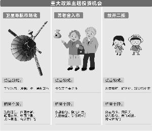 证券时报记者 汤亚平 总揽全局的政策,不仅仅是可供炒作的题材,更是一个战略投资布局的依据。例如对国企改革、新兴战略产业等的投资,许多投资者只是看成是炒作题材,往往只抓住了皮毛,浅尝辄止。其实,炒股没那么简单,对这类主题股民不能只满足于投机,而应紧跟重大政策主题,放长线钓大鱼。眼下又有不少关系到国计民生的大主题,投资者必须睁大眼睛,打起精神。 卫星导航 打开商业化空间 国家发改委、财政部和国防科工局三部门10月29日联合下发了关于印发《国家民用空间基础设施中长期发展规划(2015年~2025年)》的通知,探索国家民用空间基础设施市场化、商业化发展新机制,力求做大中国民用空间基础产业。《规划》提出,“十三五”期间将构建形成卫星遥感、卫星通信广播、卫星导航定位三大系统,基本建成国家民用空间基础设施体系,提供连续稳定的业务服务。数据共享服务机制基本完善,标准规范体系基本配套,商业化发展模式基本形成,具备国际服务能力。 北斗系统为区域性卫星导航定位系统,覆盖了中国及周边国家和地区,不仅可为中国、也可为周边国家服务。主要有三大功能:快速定位,为服务区域内的用户提供全天候、实时定位服务,定位精度与GPS相当;短报文通信,一次可传送120个汉字的信息;精密授时,精度达20纳秒。同时具备定位与通讯功能,不需要其他通讯系统支持。 分析人士表示,北斗系统具备3项基本功能,信息安全性好,与GPS等国外系统相比,有明显的技术优势。但以前北斗系统的应用缺乏国家政策的支持,技术优势得不到发挥。现在政策明确,及时整合中国卫星导航系统的组织管理体制,建立民用主管部门、确立国际合作主管机构已经提上议事日程,并成为当务之急。 目前我国北斗导航系统已经广泛服务于国土、测绘、城建、水利、交通和应急救灾等诸多关键领域,而随着我国卫星导航技术日趋成熟,在轨航天器数量和性能不断提升,未来产业将在民用领域实现快速发展,而更广泛的商业化应用将有效产业发展成果转化为相关公司的业绩,行业内上市公司的盈利水平在中长期将获得有力支撑。 借养老金入市 完善资本市场 10月27日上午,人社部召开今年第三季度新闻发布会,人社部新闻发言人李忠介称,人社部将于2016年启动实施基本养老保险基金投资运营工作。 诚然,养老金入市不等于救市,也不等于带来牛市,而是为了保值增值。根据人社部的测算,养老金入市的总规模可能超过2万亿元。事实上,远离资本市场的养老金隐形损失巨大,中国社科院世界社会保障中心主任郑秉文曾以CPI作为基准测算,养老金在过去20年贬值将近千亿元。今年夏季,人社部曾发布的报告也显示,养老金过去的收益较低:2009年至2014年的数据分别为2.2%、2.0%、2.5%、2.6%、2.4%和2.9%,低于同期一年期银行存款利率,增值压力巨大。 可是,养老金既然入市,就必然对股市产生影响。可比较的是,在养老金之前,社会保险基金(社保基金)早已于2001年开始试水股票市场。从数据上看,社保基金干得不错。据全国社保基金理事会统计,全国社保基金自建立以来,年均投资收益率8.38%,其中2014年达到11.69%,远超同期通货膨胀率,也明显高于目前各地基金的实际收益率。而在股市险资有先知先觉的美誉,成为投资的风向标。毫无疑问,养老金“航母”将改变市场投资者结构和股市生态。 截至2014年,全国共有九个省养老金超过1000亿。其中,广东省累计结余高达5128亿元,占到全国总量的六分之一。广东省早在2012年就已经拿出1000亿元养老金委托全国社保基金理事会投资运营,三年累计收益率为5.55%,成绩可嘉。人社部、财政部两部委8月末召开的国务院吹风会透露,入市资金规模由各省确定,而入市的时间表由市场投资机构决定。 全面放开二孩 政策影响深远 十八届五中全会闭幕,喜大普奔的事儿莫过于全面放开二孩政策了! 10月29日,中央“全面实施一对夫妻可生育两个孩子政策”“允许普遍二孩政策”一经落地便引发热议,除了大家探讨的“人口红利”、“儿童商机”、“抚养孩子成本”外,股市炒作更是全面开花:母婴医疗、儿童用药、母婴生活用品、玩具动漫、婴幼儿教育、婴童服饰、儿童车MPV等,不少开发商还嗅到楼市向好的气息。 最近的一项调查表明:目前在我国,购房主力年龄段在20~44岁,大部分人在25~30岁期间就会面临首次买房置业需求。根据测算,全面放开二胎后至2050年,20~44岁的人口比例将比之前增加4%,达到1.28亿人,这部分绝不算少的新增人口,势必会有相应的住房需求,对提振楼市大环境、延缓楼市增量房增速下滑会起到一定作用,对去化当前楼市的积压库存也有积极意义。 总体上,完全放开二孩是未来的大趋势,虽然短期难以成行,但这这项重大政策调整已经形成了“二孩放开的预期”。允许普遍二孩政策预期的存在让相关公司在较长的时间内都可以被作为主体来炒作。 本版导读:
