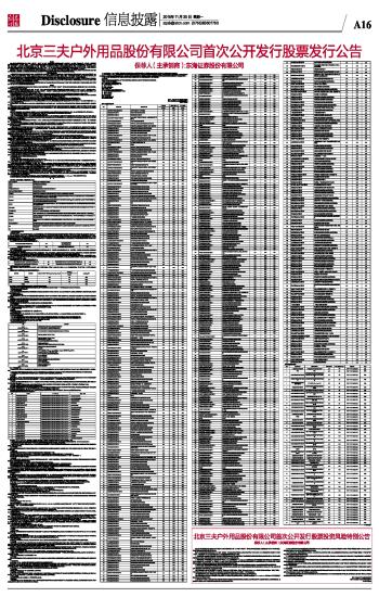 北京三夫户外用品股份有限公司首次公开发行股票投资风险特别公告保荐人(主承销商):东海证券股份有限公司 2015-11-30 来源:证券时报网 作者: