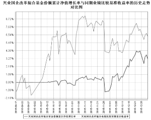 基金管理人:兴业基金管理有限公司 基金托管人:交通银行股份有限公司 报告送出日期:2016年1月22日 §1 重要提示 基金管理人的董事会及董事保证本报告所载资料不存在虚假记载、误导性陈述或重大遗漏,并对其内容的真实性、准确性和完整性承担个别及连带责任。 基金托管人交通银行股份有限公司根据本基金合同规定,于2016年1月20日复核了本报告中的财务指标、净值表现和投资组合报告等内容,保证复核内容不存在虚假记载、误导性陈述或者重大遗漏。 基金管理人承诺以诚实信用、勤勉尽责的原则管理和运用基金资产,但不保证基金一定盈利。 基金的过往业绩并不代表其未来表现。投资有风险,投资者在做出投资决策前应仔细阅读本基金的招募说明书。 本报告中财务资料未经审计。 本报告期自2015年10月1日起至12月31日止。 §2 基金产品概况 ■ §3 主要财务指标和基金净值表现 3.1 主要财务指标 单位:人民币元 ■ 注:1、本期已实现收益指基金本期利息收入、投资收益、其他收入(不含公允价值变动收益)扣除相关费用后的余额,本期利润为本期已实现收益加上本期公允价值变动收益。 2、所述基金业绩指标不包括持有人认购或交易基金的各项费用,计入费用后实际收益水平要低于所列数字。 3.2 基金净值表现 3.2.1 本报告期基金份额净值增长率及其与同期业绩比较基准收益率的比较 ■ 3.2.2 自基金合同生效以来基金累计净值增长率变动及其与同期业绩比较基准收益率变动的比较 ■ 注:1、本基金基金合同于2015年9月17日生效,截至报告期末本基金基金合同生效未满一年。 2、根据本基金基金合同规定,基金管理人应当自基金合同生效之日起6个月内使基金的投资组合比例符合基金合同的有关约定。截止本报告期末本基金仍处于建仓期。 §4 管理人报告 4.1 基金经理(或基金经理小组)简介 ■ 4.2 管理人对报告期内本基金运作遵规守信情况的说明 本报告期内,本基金管理人严格遵守《中华人民共和国证券投资基金法》及其配套法律法规、基金合同的约定,本着诚实信用、勤勉尽责的原则管理和运用基金资产,在严格控制风险的基础上,为基金份额持有人谋求最大利益。报告期内,本基金运作整体合法合规,未发现损害基金持有人利益的行为。 4.3 公平交易专项说明 4.3.1 公平交易制度的执行情况 报告期内,本基金管理人严格执行《证券投资基金管理公司公平交易制度指导意见》,完善相应制度和流程,通过系统和人工等方式在各环节严格控制交易公平执行,公平对待旗下管理的基金和投资组合。 4.3.2 异常交易行为的专项说明 报告期内未发现本基金存在异常交易行为。 4.4 报告期内基金的投资策略和业绩表现说明 4.4.1 报告期内基金投资策略和运作分析 由于判断市场处于"股灾"后的震荡回落期、且基金处于建仓期,本基金在四季度初建仓相对较慢,股票仓位在11月中旬之后才逐步上升,这使得本基金净值涨幅在四季度前期明显跑输基准。之后,本基金通过积极建仓,把握市场的结构性机会,产品净值在12月份有一定上升,该段时间也明显跑赢主要指数。本基金因为是定位在国企改革方面的主题基金,因此在行业配置上没有明显的倾向性,考虑到国企改革前期力度较大的案例多发生在竞争性的商业领域,因此基金配置较多的主要是医药、消费及金融等。本基金在个股层面的配置相对分散。 4.4.2 报告期内基金的业绩表现 报告期内,本基金份额净值增长率为3.20%,同期业绩比较基准收益率为8.02%。 4.5 管理人对宏观经济、证券市场及行业走势的简要展望 我们认为,2016年中国整体宏观经济仍将延续2015年相对偏弱的态势。股票市场在经历了2015年的“疯牛”“股灾”之后,基本面的压力、流动性的支撑、政策的友好等影响因素的边际力量都在弱化,人民币持续贬值的压力将使得一季度市场弱势震荡的可能性较大。 首先,国内经济有望呈现弱势企稳格局。由于长期经济增速仍在下行通道中,2016年上半年又受制于2015年上半年的高基数,经济增长企稳的压力仍较大。物价方面,由于猪价难以独立经济周期启动,CPI反弹的动能仍较弱;PPI跌幅有所企稳,但国内供给侧改革仍任重而道远。 其次,货币政策继续放松但空间已有限。目前,一年期定存利率已经降至1.5%,美国已开启新一轮加息周期,预计2016年仍有不少于2次的加息,中美利差快速缩小。在人民币持续贬值,资本外流仍然不小的背景下,预计央行将通过持续降准来对冲。但实体经济真实融资成本仍然高企,降准难以推动信贷显著增长。总体来看,尽管2016年货币政策仍维持宽松格局,但货币政策对市场的影响力在不断下降。 此外,在经历了2015年四季度持续反弹之后,中小创个股估值仍然偏高,安全边际有限,短期供给的压力仍强于需求。从供给端来看,压力也在增大,2016年注册制将启动、上交所战略新兴板也有望推出,2015年下半年被监管机构限制的大股东减持也将逐步放开。需求方面,全社会无风险收益率的下降、资产荒、居民对金融资产的配置需求以及养老金入市等长期资金将为市场提供支撑。 综上,预计2016年股市压力较2015年明显增大,弱势震荡将成一季度乃至更长时间内市场主基调。 4.6 报告期内基金持有人数或基金资产净值预警说明 本报告期内,本基金不存在连续二十个工作日基金份额持有人数量不满二百人或者基金