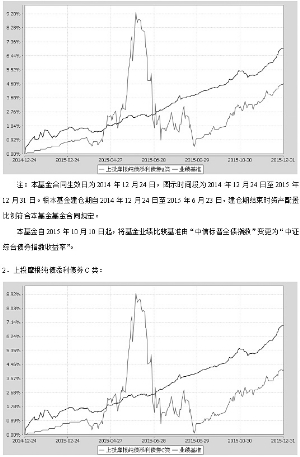 基金管理人:上投摩根基金管理有限公司 基金托管人:中国建设银行股份有限公司 报告送出日期:二〇一六年一月二十二日 §1 重要提示 基金管理人的董事会及董事保证本报告所载资料不存在虚假记载、误导性陈述或重大遗漏,并对其内容的真实性、准确性和完整性承担个别及连带责任。 基金托管人中国建设银行股份有限公司根据本基金合同规定,于2016年1月21日复核了本报告中的财务指标、净值表现和投资组合报告等内容,保证复核内容不存在虚假记载、误导性陈述或者重大遗漏。 基金管理人承诺以诚实信用、勤勉尽责的原则管理和运用基金资产,但不保证基金一定盈利。 基金的过往业绩并不代表其未来表现。投资有风险,投资者在作出投资决策前应仔细阅读本基金的招募说明书。 本报告中财务资料未经审计。 本报告期自2015年10月1日起至12月31日止。 §2 基金产品概况 ■ §3 主要财务指标和基金净值表现 3.1 主要财务指标 单位:人民币元 ■ 注:本期已实现收益指基金本期利息收入、投资收益、其他收入(不含公允价值变动收益)扣除相关费用后的余额,本期利润为本期已实现收益加上本期公允价值变动收益。 上述基金业绩指标不包括持有人认购或交易基金的各项费用(例如,开放式基金的申购赎回费、红利再投资费、基金转换费等),计入费用后实际收益水平要低于所列数字。 3.2 基金净值表现 3.2.1本报告期基金份额净值增长率及其与同期业绩比较基准收益率的比较 1、上投摩根纯债添利债券A类: ■ 2、上投摩根纯债添利债券C类: ■ 3.2.2 自基金合同生效以来基金累计净值增长率变动及其与同期业绩比较基准收益率变动的比较 上投摩根纯债添利债券型证券投资基金 累计净值增长率与业绩比较基准收益率的历史走势对比图 (2014年12月24日至2015年12月31日) 1.上投摩根纯债添利债券A类: ■ 注:本基金合同生效日为2014年12月24日,图示时间段为2014年12月24日至2015年12月31日。根本基金建仓期自2014年12月24日至2015年6月23日,建仓期结束时资产配置比例符合本基金基金合同规定。 本基金自2015年10月10日起,将基金业绩比较基准由“中信标普全债指数”变更为“中证综合债券指数收益率”。 2.上投摩根纯债添利债券C类: ■ 注:本基金合同生效日为2014年12月24日,图示时间段为2014年12月24日至2015年12月31日。根本基金建仓期自2014年12月24日至2015年6月23日,建仓期结束时资产配置比例符合本基金基金合同规定。 本基金自2015年10月10日起,将基金业绩比较基准由“中信标普全债指数”变更为“中证综合债券指数收益率”。 §4 管理人报告 4.1 基金经理(或基金经理小组)简介 ■ 注:1.任职日期和离任日期均指根据公司决定确定的聘任日期和解聘日期。 2.赵峰先生为本基金首任基金经理,其任职日期指本基金基金合同生效之日。 3.证券从业的含义遵从行业协会《证券业从业人员资格管理办法》的相关规定。 4.2报告期内本基金运作遵规守信情况说明 在本报告期内,基金管理人不存在损害基金份额持有人利益的行为,勤勉尽责地为基金份额持有人谋求利益。基金管理人遵守了《证券投资基金法》及其他有关法律法规、《上投摩根纯债添利债券型证券投资基金基金合同》的规定。基金经理对个股和投资组合的比例遵循了投资决策委员会的授权限制,基金投资比例符合基金合同和法律法规的要求。 4.3 公平交易专项说明 4.3.1 公平交易制度的执行情况 报告期内,本公司继续贯彻落实《证券投资基金管理公司公平交易制度指导意见》等相关法律法规和公司内部公平交易流程的各项要求,严格规范境内上市股票、债券的一级市场申购和二级市场交易等活动,通过系统和人工相结合的方式进行交易执行和监控分析,以确保本公司管理的不同投资组合在授权、研究分析、投资决策、交易执行、业绩评估等投资管理活动相关的环节均得到公平对待。 对于交易所市场投资活动,本公司执行集中交易制度,确保不同投资组合在买卖同一证券时,按照时间优先、比例分配的原则在各投资组合间公平分配交易量;对于银行间市场投资活动,本公司通过对手库控制和交易室询价机制,严格防范对手风险并检查价格公允性;对于申购投资行为,本公司遵循价格优先、比例分配的原则,根据事前独立申报的价格和数量对交易结果进行公平分配。 报告期内,通过对不同投资组合之间的收益率差异比较、对同向交易和反向交易的交易时机和交易价差监控分析,未发现整体公平交易执行出现异常的情况。 4.3.2异常交易行为的专项说明 报告期内,通过对交易价格、交易时间、交易方向等的分析,未发现有可能导致不公平交易和利益输送的异常交易行为。 所有投资组合参与的交易所公开竞价同日反向交易成交较少的单边交易量超过该证券当日成交量的5%的情形:报告期内,所有投资组合参与的交易所公开竞价同日反向交易成交较少的单边交易量超过该证券当日成交量的5%的次数为两次,均发生在纯量化投资组合与主动管理投资组合之间。 4.4 报告期内基金的投资策略和业绩表现说明 4.4.1报告期内基金投资策略和运作分析 四季度始,人民币汇率逐步趋于稳定,但工业增加值、固定资产投资等经济指标未见明显改观。货币政策方面,10月23日,央行再次宣布降准降息,同时放开存款利率上限,完成了名义上的利率