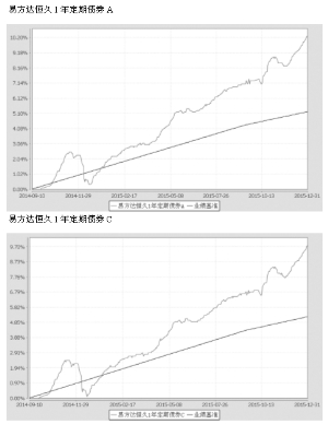 基金管理人:易方达基金管理有限公司 基金托管人:中国工商银行股份有限公司 报告送出日期:二〇一六年一月二十二日 §1 重要提示 基金管理人的董事会及董事保证本报告所载资料不存在虚假记载、误导性陈述或重大遗漏,并对其内容的真实性、准确性和完整性承担个别及连带责任。 基金托管人中国工商银行股份有限公司根据本基金合同规定,于2016年1月19日复核了本报告中的财务指标、净值表现和投资组合报告等内容,保证复核内容不存在虚假记载、误导性陈述或者重大遗漏。 基金管理人承诺以诚实信用、勤勉尽责的原则管理和运用基金资产,但不保证基金一定盈利。 基金的过往业绩并不代表其未来表现。投资有风险,投资者在作出投资决策前应仔细阅读本基金的招募说明书。 本报告中财务资料未经审计。 本报告期自2015年10月1日起至12月31日止。 §2 基金产品概况 ■ §3 主要财务指标和基金净值表现 3.1 主要财务指标 单位:人民币元 ■ 注:1.所述基金业绩指标不包括持有人认购或交易基金的各项费用,计入费用后实际收益水平要低于所列数字。 2.本期已实现收益指基金本期利息收入、投资收益、其他收入(不含公允价值变动收益)扣除相关费用后的余额,本期利润为本期已实现收益加上本期公允价值变动收益。 3.2 基金净值表现 3.2.1本报告期基金份额净值增长率及其与同期业绩比较基准收益率的比较 易方达恒久1年定期债券A ■ 易方达恒久1年定期债券C ■ 3.2.2 自基金合同生效以来基金累计净值增长率变动及其与同期业绩比较基准收益率变动的比较 易方达恒久添利1年定期开放债券型证券投资基金 累计净值增长率与业绩比较基准收益率的历史走势对比图 (2014年9月10日至2015年12月31日)■ 注:1.按基金合同和招募说明书的约定,本基金的建仓期为六个月,建仓期结束时各项资产配置比例符合基金合同(第十二部分二、投资范围,三、投资策略和四、投资限制)的有关约定。 2.自基金合同生效至报告期末,A类基金份额净值增长率为10.30%,C类基金份额净值增长率为9.80%,同期业绩比较基准收益率为5.21%。 §4 管理人报告 4.1 基金经理(或基金经理小组)简介 ■ 注:1.此处的“任职日期”为基金合同生效之日,“离任日期”为公告确定的解聘日期。 2.证券从业的含义遵从行业协会《证券业从业人员资格管理办法》的相关规定。 4.2管理人对报告期内本基金运作遵规守信情况的说明 本报告期内,本基金管理人严格遵守《证券投资基金法》等有关法律法规及基金合同、基金招募说明书等有关基金法律文件的规定,以取信于市场、取信于社会投资公众为宗旨,本着诚实信用、勤勉尽责的原则管理和运用基金资产,在控制风险的前提下,为基金份额持有人谋求最大利益。在本报告期内,基金运作合法合规,无损害基金份额持有人利益的行为。 4.3 公平交易专项说明 4.3.1 公平交易制度的执行情况 本基金管理人主要通过建立有纪律、规范化的投资研究和决策流程、交易流程,以及强化事后监控分析来确保公平对待不同投资组合,切实防范利益输送。本基金管理人规定了严格的投资权限管理制度、投资备选库管理制度和集中交易制度等,并重视交易执行环节的公平交易措施,以“时间优先、价格优先”作为执行指令的基本原则,通过投资交易系统中的公平交易模块,以尽可能确保公平对待各投资组合。本报告期内,公平交易制度总体执行情况良好。 4.3.2 异常交易行为的专项说明 本报告期内,公司旗下所有投资组合参与的交易所公开竞价交易中,同日反向交易成交较少的单边交易量超过该证券当日成交量的5%的交易共有6次,其中5次为指数及量化组合因投资策略需要和其他组合发生的反向交易;1次为不同基金经理管理的基金因投资策略不同而发生的反向交易,有关基金经理按规定履行了审批程序。 本报告期内,未发现本基金有可能导致不公平交易和利益输送的异常交易。 4.4 报告期内基金的投资策略和业绩表现说明 4.4.1报告期内基金投资策略和运作分析 2015年四季度,经济基本面仍然偏弱,9月份和10月份的数据都低于预期,表示复苏力度明显较弱,11月工业数据有所回升,工业增加值同比增长6.2%,高于预期,表现出了企稳的态势。其中经济的亮点是汽车高速增长,但是可持续性存疑。消费可能受到双十一的影响有所提升,而投资则受到基建投资和其他投资的拉动保持了较高的增速,但是从房地产和制造业投资以及信贷结构表现来看,经济主体自主投资意愿可能仍然较弱。 通胀方面,四季度通胀水平仍处于低位,非食品价格月度环比在9月和10月连续两个月为负,11月份虽转为正值,但持续性存疑。中上游价格在前期大幅下跌的基础上仍在快速下跌,尤其是加工工业环比跌幅扩大,说明了经济需求的疲弱。 融资方面,考虑地方政府债和外汇流出的社融环比有所下降。人民币贷款结构则明显恶化,企业中长期贷款甚至票据(包括未贴现票据)明显恶化,反映经济主体预期仍不乐观。融资供需内生性收缩的风险仍然值得警惕。 四季度,债券市场整体上涨。权益市场大幅波动、IPO暂停等事件使得打新资金、股市配资等追求无风险收益的资金大量堆积,理财收益率也出现缓慢下行,非标类高收益资产普遍减少,这些都对债券的需求形成支撑。债券市场边际上需求大幅增加而供给有限,使债券市场收