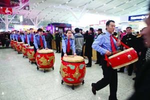 昨日,为期40天的2016年春运在“霸王级”寒潮中拉开帷幕。据交通运输部预测,春运期间全国旅客发送量将达到29.1亿人次,同比增长3.6%。图为春运第一天,深圳北站工作人员敲锣打鼓,以热闹的气氛为旅客“驱寒”。IC/供图 本版导读: