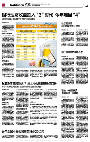 银行理财收益跌入“3”时代 今年难回“4”目前的平均收益水平已经创下2011年5月份以来的新低 2016-01-27 来源:证券时报网 作者:王莹