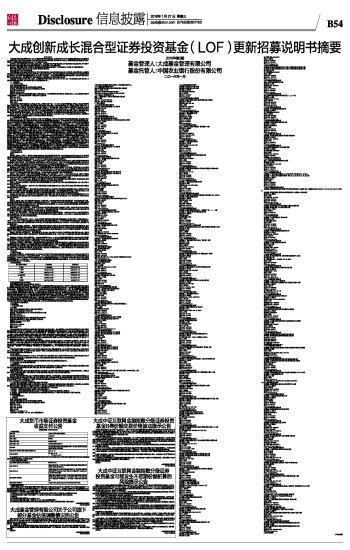 大成基金管理有限公司关于公司旗下 部分基金估值调整情况的公告 根据中国证监会《关于进一步规范证券投资基金估值业务的指导意见》(中国证券监督管理委员会公告[2008]38号)的有关规定,经与基金托管人协商一致,自2016年1月26日起,大成基金管理有限公司对旗下证券投资基金(交易型开放式指数证券投资基金除外)持有的“上海佳豪(代码:300008)、海格通信(代码:002465)、拓维信息(代码:002261)”采用 《中国证券业协会基金估值工作小组关于停牌股票估值的参考方法》中的“指数收益法”进行估值。 待上述股票复牌且交易体现活跃市场交易特征后,将恢复为采用当日收盘价格进行估值,届时不再另行公告,敬请投资者予以关注。 风险提示:本公司承诺以诚实信用、勤勉尽责的原则管理和运用基金资产,但不保证基金一定盈利,也不保证最低收益。敬请投资人注意投资风险。 特此公告 大成基金管理有限公司 2016年1月27日 大成中证互联网金融指数分级证券投资 基金B类份额交易价格波动提示公告 大成基金管理有限公司(以下简称“本基金管理人”)旗下大成中证互联网金融指数分级证券投资基金之B类份额(场内简称:网金B;场内代码502038)二级市场交易价格连续大幅下跌,2016年1月25日,大成中证互联网金融B类份额在二级市场的收盘价为0.415元,相对于当日0.4200元的基金份额参考净值,折价幅度达到1.19%。截止2016年1月26日,大成中证互联网金融B类份额二级市场的收盘价为0.374元,明显高于基金份额参考净值,投资者如果盲目投资,可能遭受重大损失。 为此,本基金管理人提示如下: 1、大成中证互联网金融B类份额表现为高风险、高收益的特征。由于大成中证互联网金融B类份额内含杠杆机制的设计,大成中证互联网金融B类份额参考净值的变动幅度将大于大成中证互联网金融份额(场内简称:互联金融;场内代码502036)净值和大成中证互联网金融A类份额(场内简称:网金A;场内代码502037)参考净值的变动幅度,即大成中证互联网金融B类份额的波动性要高于其他两类份额,其承担的风险也较高。大成中证互联网金融B类份额的持有人会因杠杆倍数的变化而承担不同程度的投资风险。 2、大成中证互联网金融B类份额的交易价格,除了有份额参考净值变化的风险外,还会受到市场的系统性风险、流动性风险等其他风险影响,可能使投资人面临损失。 3、截至2016年1月26日收盘,大成中证互联网金融B类份额的基金份额参考净值接近基金合同约定的不定期份额折算阀值。不定期份额折算后,大成中证互联网金融B类份额的折溢价率可能发生较大变化。特提请参与二级市场交易的投资者注意高折溢价所带来的风险。 4、截至本公告披露日,大成中证互联网金融指数分级证券投资基金运作正常。本基金管理人仍将严格按照法律法规及基金合同进行投资运作。 5、截至本公告披露日,大成中证互联网金融指数分级证券投资基金无其他应披露而未披露的重大信息。本基金管理人仍将严格按照有关规定和要求,及时做好信息披露工作。 6、基金管理人承诺以诚实信用、勤勉尽责的原则管理和运用基金资产,但不保证基金一定盈利,也不保证最低收益。投资者投资于本基金前应认真阅读本基金的基金合同和招募说明书等相关法律文件。 敬请投资者注意投资风险。 特此公告 大成基金管理有限公司 2016年1月27日
