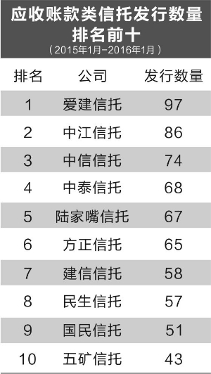 用益信托网最新数据统计,自去年1月份以来的13个月中,50家信托公司共计发行1025款应收账款类信托产品。其中,爱建信托、中江信托、中信信托发行最为积极。 证券时报·信托百老汇记者发现,融资主体主要来自地方城投公司以及城市基础建设、商业地产、交通、农业、制造业等行业。其中,地方融资平台公司占比较高。 应收账款类信托大都属于基础产业类,标的多为融资方对地方政府的应收账款。 格上理财研究院信托研究员王燕娱分析,近期基础产业类信托规模持续攀升主要有如下原因。一是基础产业类信托资金多用于地方基础设施建设,大多包含政府信用,投资者认可度较高;二是尽管近两年有兑付风险出现,但基础产业类信托至今无一例实质违约,基础产业信托安全性仍相对较高;三是其他类型产品相对减少,基础产业类的发行就相应增多;四是由于政府支持公私合作模式(PPP),近两年陆续出台一些限制其他融资渠道的政策,传统基础产业类信托发展空间进一步收窄。因此,作为“收尾”产品,基础产业类信托受到投资者和信托机构的热捧。 预期年收益 最高达11.9% 数据显示,2015年,应收账款类信托平均预期年收益率区间为8.35%~9.65%。预期年收益方面,最高的中信民乐5号·成都龙泉国资应收账款流动化信托项目达11.9%,最低项目为7.2%。 各家信托公司在做法上稍有差异。最普遍的模式,如爱建信托发行的“镇江经开信政应收账款收益权融资集合资金信托计划”,募资用于受让镇江经开享有的对镇江新区管委会的71426.89万元的应收账款收益权。镇江经开将标的应收账款质押登记给信托公司,并由镇江城投提供连带担保。 部分信托公司在此类结构的基础上增加流动性结构设计,对信托受益权进行分层,设置优先级、中间级、劣后级,通过向合格投资人发售优先级和中间级信托受益权的方式实现应收账款流动化。风控上,由委托人推荐关联企业认购中间级受益权,受偿顺序劣后于同期发行的优先级受益权。 还有信托公司将应收账款类信托计划定义为“财产权信托”,风控更为完善,签署三方《债权债务确认协议》,并要求政府出具相关财政资金安排的函件,在此基础上与融资主体签订回购协议,或者设置土地等抵押物作为保障。 多位信托从业者向记者表示,投资应收账款类信托产品要注意三点:首先,需要了解清楚产品的融资方是谁。其次,考察应收账款的债务人是否具备四个基本条件:信用记录良好;无恶意拖欠上游企业款项的行为;生产经营正常,现金流量充足,无重大经济纠纷或资不抵债等潜在风险;是卖方的非关联企业。最后,考察增信措施的设置,采用股权、土地抵质押或第三方担保等模式的产品安全性较高,信托规模相对应收账款的折扣率越低越好。 “我们看到,不少信托机构开始参与PPP项目,形成新的基础产业类信托模式。”王燕娱表示,同时,我国城镇化进程大趋势没有改变,地方基础设施建设需求仍然较大,信托在基础产业领域依然有较好发展前景。 本版导读: