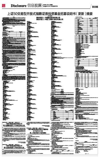 重要提示 上证50交易型开放式指数证券投资基金(以下简称“本基金”)经中国证监会2004年11月22日证监基金字[2004]196号文批准募集。本基金基金合同于2004年12月30日正式生效。 基金管理人保证本招募说明书的内容真实、准确、完整。本招募说明书经中国证监会核准,但中国证监会对本基金的核准,并不表明其对本基金的价值和收益作出实质性判断或保证,也不表明投资于本基金没有风险。 本基金投资于证券市场,基金净值会因为证券市场波动等因素产生波动,投资者根据所持有的基金份额享受基金收益,同时承担相应的投资风险。本基金投资中的风险包括:因整体政治、经济、社会等环境因素对证券市场价格产生影响而形成的系统性风险,个别证券特有的非系统性风险,本基金的特定风险等。本基金属股票基金,风险与收益高于混合基金、债券基金与货币市场基金。本基金为指数型基金,采用完全复制策略,跟踪上证50指数,是股票基金中风险较低、收益中等的产品。投资有风险,投资人申购基金时,应认真阅读本招募说明书,全面认识本基金的风险收益特征和产品特性,并充分考虑自身的风险承受能力,理性判断市场,谨慎做出投资决策。 基金的过往业绩并不预示其未来表现。 基金管理人依照恪尽职守、诚实信用、谨慎勤勉的原则管理和运用基金财产,但不保证基金一定盈利,也不保证最低收益。 本摘要根据本基金的基金合同和招募说明书编写,并经中国证监会核准。基金合同是约定基金当事人之间权利、义务的法律文件。基金投资人自依基金合同取得基金份额,即成为基金份额持有人和本基金合同的当事人,其持有基金份额的行为本身即表明其对基金合同的承认和接受,并按照《基金法》、《运作办法》、基金合同及其他有关规定享有权利、承担义务。基金投资人欲了解基金份额持有人的权利和义务,应详细查阅基金合同。 本招募说明书所载内容截止日为2015年12月30日,有关财务数据和净值表现数据截止日为2015年9月30日。(本招募说明书中的财务资料未经审计) 一、基金管理人 (一)基金管理人概况 名称:华夏基金管理有限公司 住所:北京市顺义区天竺空港工业区A区 办公地址:北京市西城区金融大街33号通泰大厦B座12层 设立日期:1998年4月9日 法定代表人:杨明辉 联系人:张静 客户服务电话:400-818-6666 传真:010-63136700 华夏基金管理有限公司注册资本为23800万元,公司股权结构如下: ■ (二)主要人员情况 1、基金管理人董事、监事、经理及其他高级管理人员基本情况 杨明辉先生:董事长、党委书记,中信证券股份有限公司执行董事、党委委员,硕士,高级经济师。兼任华夏资本管理有限公司董事长。曾任中信证券公司董事、襄理、副总经理,中信控股公司董事、常务副总裁,中国建银投资证券有限责任公司党委副书记、执行董事、总裁,兼任信诚基金管理有限公司董事长等。 杨一夫先生:董事,硕士。现任鲍尔太平有限公司总裁,负责总部加拿大鲍尔公司在中国的投资活动,兼任三川能源开发有限公司董事、中国投资协会常务理事。曾任国际金融公司(世界银行组织成员)驻中国的首席代表等。 胡祖六先生:董事,博士,教授。现任春华资本集团主席。曾任国际货币基金组织高级经济学家,达沃斯世界经济论坛首席经济学家,高盛集团大中华区主席、合伙人、董事总经理。 徐刚先生:董事,博士。现任中信证券执行委员会委员、董事总经理、经纪业务发展与管理委员会主任、战略规划部行政负责人,亦担任中信证券(山东)有限责任公司、中信期货有限公司、前海股权交易中心(深圳)有限公司、青岛蓝海股权交易中心有限责任公司、厦门两岸股权交易中心有限公司、证通股份有限公司等公司董事。 葛小波先生:董事,硕士。现任中信证券执行委员会委员、董事总经理、全球首席财务官、财务负责人,亦担任金石投资有限公司、中信证券投资有限公司等公司董事,中信证券上海自贸试验区分公司负责人。葛先生于2007年荣获全国金融五一劳动奖章。 汤晓东先生:董事、总经理,硕士。兼任华夏资本管理有限公司董事、上海华夏财富投资管理有限公司董事长。曾任职于摩根大通、荷兰银行、苏格兰皇家银行、中国证监会等。 朱武祥先生:独立董事,博士,教授。现任清华大学经济管理学院金融系教授、博士生导师,兼任北京建设(香港上市)、华夏幸福基业、中海油海洋工程、荣信股份、东兴证券等五家上市公司独立董事。 贾建平先生:独立董事,大学本科,高级经济师。现已退休。兼任东莞银行独立董事。曾任职于北京工艺品进出口公司、美国纽约中国物产有限公司(外派工作),曾担任中国银行信托咨询公司副处长、处长,中国银行卢森堡公司副总经理,中国银行意大利代表处首席代表,中银集团投资管理公司副董事长、总经理,中国银行重组上市办公室、董事会秘书办公室、上市办公室总经理,中银基金管理有限公司董事长。 谢德仁先生:独立董事,博士,教授。现任清华大学经济管理学院会计学教授、博士生导师,兼任同方环境股份有限公司、博彦科技股份有限公司(上市公司)、朗新科技股份有限公司独立董事,中国会计学会第八届理事会理事,中国会计学会财务成本分会第八届理事会副会长。 张霄岭先生:副总经理,博士。现兼任上海高级金融学院客座教授、清华大学五