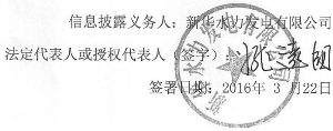 重庆三峡水利电力(集团)股份有限公司 简式权益变动报告书 上市公司名称:重庆三峡水利电力(集团)股份有限公司 股票上市地点:上海证券交易所 股票简称:三峡水利 股票代码:600116 信息披露义务人:新华水力发电有限公司 注册地址:北京市门头沟区石龙经济开发区永安路20号3幢B1-0808室 通讯地址:北京市丰台区海鹰路1号院7号楼 股份变动性质:股份减少 签署日期:二零一六年三月二十二日 信息披露义务人声明 一、本报告书系信息披露义务人依据《中华人民共和国证券法》、《上市公司收购管理办法》、《公开发行证券的公司信息披露内容与格式准则第 15 号——权益变动报告书》等法律、法规和规范性文件编制。 二、依据《证券法》、《收购办法》的规定,本报告书已全面披露信息披露义务人在重庆三峡水利电力(集团)股份有限公司拥有权益的股份。 截至本报告书签署日,除本报告书披露的持股信息外,信息披露义务人没有通过任何其他方式增加或减少在重庆三峡水利电力(集团)股份有限公司拥有权益的股份。 三、信息披露义务人签署本报告已获得必要的授权和批准,其履行亦不违反信息披露义务人的《公司章程》或内部规则中的任何条款,或与之相冲突。 四、本次权益变动是根据本报告所载明的资料进行的。除本信息披露义务人外,没有委托或者授权任何其他人提供未在本报告书中列载的信息和对本报告书做出任何解释或者说明。 第一节 释义 在本简式权益变动报告书中,除非文义载明,下列简称具有如下含义: ■ 第二节 信息披露义务人介绍 一、信息披露义务人基本情况 1、信息披露义务人:新华水力发电有限公司 2、注册地址:北京市门头沟区石龙经济开发区永安路20号3幢B1-0808室 3、法定代表人:徐晓明 4、注册资本:120000万元 5、公司类型:其他有限责任公司 6、成立日期:2009年11月17日 7、营业期限:2009年11月17日至 长期 8、营业执照注册号:110000012428977 9、税务登记证号码:110109697734636 10、经营范围:电力生产;项目投资;投资管理;水力水电工程建设咨询;技术服务;设备租赁;销售机械电器设备;货物进出口;技术进出口;代理进出口。 11、通讯地址:北京市丰台区海鹰路1号院7号楼 12、邮政编码:100070 13、股东情况: 中国核工业建设集团公司(持股55%); 新华水利控股集团公司(持股45%)。 二、信息披露义务人董事及主要负责人基本情况 ■ 三、信息披露义务人在境内、境外其他上市公司中持有、控制权益的股份达到或超过该公司已发行股份5%的情况 截至本报告书签署之日,新华发电除持有三峡水利外,没有在境内、境外其他上市公司中拥有权益的股份达到或超过该公司已发行股份5%的情况。 第三节 信息披露义务人减持目的 信息披露义务人减持三峡水利股份的目的是为了满足新华发电资金需求。 信息披露义务人在未来12个月内没有继续减持或增持三峡水利股份的计划。 第四节 权益变动方式 一、本次权益变动前信息披露义务人持股情况 本次权益变动前,信息披露义务人共持有三峡水利20,000,000股的股份,占三峡水利总股本(331,001,834股)的6.04%。 二、本次权益变动的具体情况 1、信息披露义务人于2015年5月22日通过大宗交易减持三峡水利无限售条件流通股6,000,000股,占三峡水利总股本的1.81%;本次减持后,本公司持有三峡水利股份占总股本的4.23%。 2、信息披露义务人于2015年5月25日通过大宗交易减持三峡水利无限售条件流通股10,000,000股,占三峡水利总股本的3.02%; 截止2015年5月25日,信息披露义务人合计减持三峡水利16,000,000股,占三峡水利总股本的4.83%。 3、信息披露义务人于2015年7月通过证券公司定向资产管理方式增持三峡水利2,357,500股,占三峡水利总股本的0.71%; 4、信息披露义务人于2016年3月22日通过大宗交易减持三峡水利无限售条件流通股4,000,000股,占三峡水利总股本的1.21%。 本次权益变动后,新华发电持有三峡水利2,357,500股的股份,占三峡水利总股本的0.71%。 本次权益变动情况具体如下: ■ 除特别说明外,本报告书中数值保留两位小数,若出现总数与各分项数值之和尾数不符的情况,均为四舍五入原因造成。 三、股份存在权利限制的说明 本报告书所涉及权益变动部分的股份不存在任何权利限制。 第五节 信息披露义务人前六个月买卖上市公司股票的情况 除前述情况之外,信息披露义务人在本报告书签署之日前6个月内不存在以其他方式买卖三峡水利股票的情形。 第六节 其他重大事项 截止本报告书签署之日,信息披露义务人不存在其他应当披露的为避免对本报告书内容产生误解而必须披露的其他信息。 第七节 备查文件 一、备查文件 1、信息披露义务人的企业法人营业执照; 2、信息披露义务人的董事及主要负责人身份证明文件。 二、备查文件置备地点 新华水力发电有限公司董事会办公室 联系电话:010-83682377 ■ 附表: 重庆三峡水利电力(集团)股份有限公司简式权益变动报告书 ■ ■ 本版导读: