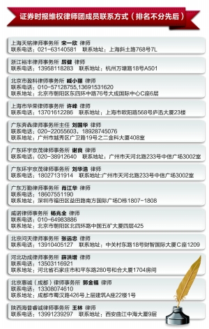 此次进行索赔征集活动的证券时报维权律师团成员包括但不限于:上海天铭律师事务所宋一欣律师、浙江裕丰律师事务所厉健律师、广东奔犇律师事务所主任刘国华律师、北京市盈科律师事务所臧小丽律师、上海市华荣律师事务所许峰律师、广东环宇京茂律师事务所谢良律师和刘华浩律师、广东万勤律师事务所肖江华律师、威诺律师事务所杨兆全律师、北京问天律师事务所张远忠律师、北京惠诚(成都)律师事务所郭金福律师、河北功成律师事务所薛洪增律师、陕西海普睿诚律师事务所王林律师等,律所分布在北京、上海、广州、深圳、杭州、成都、河北、西安等地。投资者可以根据自己的实际情况选择适合的律师事务所进行起诉准备。