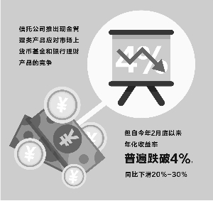 跌破4%!现金管理类信托产品收益率继续下降和银行存款、货币基金相比,现金管理类信托收益率更高,但逐渐低于银行理财产品 2016-03-28 来源:证券时报网 作者:胡飞军 罗晓霞