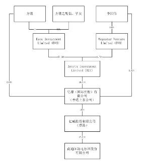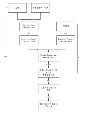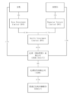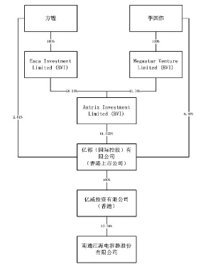 证券代码:002484 证券简称:江海股份 公告编号:2016-025 南通江海电容器股份有限公司 关于实际控制人家族成员间调整股权 比例的提示性公告 本公司及其董事、监事、高级管理人员保证公告内容真实、准确和完整,并对公告中的虚假记载、误导性陈述或者重大遗漏承担责任。 一、重要提示: 南通江海电容器股份有限公司(以下简称"公司"或"江海股份")于近日接到公司实际控制人方铿先生关于其家族成员间股权调整的告知函(本次股权调整不会引起公司控股股东及实际控制人变更),现就有关情况公告如下: 一、亿威投资股权结构变更的情况 本次变更前,亿威投资的股权结构如下: ■ 本次变更,方铿先生将其持有的Esca Investment Limited 100%股权转让给方铿先生及其配偶、子女共同持股的Fang Brothers Holdings Limited(肇丰集团有限公司,以下简称"肇丰集团",方铿先生及其配偶边敏芝女士、其子女方淑君女士、方淑仪女士、方淑明女士、方仁德先生各持有肇丰集团1%、19%、20%、20%、20%、20%股权)。 2016年3月8日,方铿先生及其夫人边敏芝女士、其子女方淑君女士、方淑仪女士、方淑明女士、方仁德先生签署《表决契据》,就其作为肇丰集团股东所享有的股东投票权作出约定。根据《表决契据》第3款、第4款及第7款有关约定,边敏芝女士、方淑君女士、方淑仪女士、方淑明女士及方仁德先生同意就肇丰集团实际运营中需股东投票的涉及Esca、Antrix Investment Limited、亿都(国际控股)有限公司、亿威投资及江海股份有关事宜(以下简称"有关事宜")听从方铿先生的指示行使其各自投票权。 本次股权转让完成后,方铿先生就上述有关事宜实际上控制肇丰集团股东大会100%投票权;因而,方铿先生仍可通过肇丰集团享有Esca Investment Limited股东大会100%投票控制权。 本次变更后,亿威投资的股权结构如下: ■ 二、本次实际控制人家族成员间股权调整对公司的影响 本次亿威投资的实际控制人家族成员间股权调整完成后,亿威投资仍持有公司37.50%的股权,仍为公司控股股东;方铿先生仍为公司的实际控制人。 特此公告。 南通江海电容器股份有限公司 2016年4月7日 本版导读: