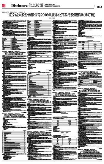 证券代码:600739 证券简称:辽宁成大 编号:临2016-050 辽宁成大股份有限公司关于修改 2016年度非公开发行股票方案的公告 本公司董事会及全体董事保证本公告内容不存在任何虚假记载、误导性陈述或者重大遗漏,并对其内容的真实性、准确性和完整性承担个别及连带责任。 辽宁成大股份有限公司(以下简称“公司”)2016年度非公开发行股票方案已经公司第八届董事会第十四次(临时)会议审议通过,具体内容详见公司2016年2月24日披露在指定信息披露媒体上海证券交易所网站(www.sse.com.cn)的有关公告。 富邦人寿保险股份有限公司由于政策原因不能参与认购,需要解除《关于认购非公开发行股票的合同》;另一方面,综合考虑公司及资本市场的实际状况,并根据《上市公司证券发行管理办法》、《上市公司非公开发行股票实施细则》等有关法律、法规的要求,公司对2016年度非公开发行股票方案进行修改,具体调整方案如下: 一、发行对象 原方案为: 本次非公开发行股票的发行对象为辽宁省国有资产经营有限公司、巨人投资有限公司、富邦人寿保险股份有限公司和中欧保税物流有限公司。 在本次非公开发行股票方案提交董事会审议前,公司与相应发行对象签署了附条件生效的股份认购合同。 公司与辽宁省国有资产经营有限公司、巨人投资有限公司、中欧保税物流有限公司签订附条件生效的股份认购合同约定本次发行一经公司董事会、股东大会批准并经辽宁省国有资产监督管理委员会批复同意及中国证监会核准,该合同即应生效。公司与富邦人寿保险股份有限公司签订附条件生效的股份认购合同约定本次发行一经乙方董事会审议批准及符合台湾地区法律法规的相关要求,如果须经台湾地区主管机关同意的,已经取得该主管机关的同意,并经公司董事会、股东大会批准、辽宁省国有资产监督管理委员会批复同意及中国证监会核准,该合同即应生效。 本次非公开发行不安排向原股东进行配售。 调整为: 本次非公开发行股票的发行对象为辽宁省国有资产经营有限公司、巨人投资有限公司、银河金汇证券资产管理有限公司和中欧保税物流有限公司。 在本次非公开发行股票方案提交董事会审议前,公司与相应发行对象签署了附条件生效的股份认购合同。 公司与辽宁省国有资产经营有限公司、巨人投资有限公司和中欧保税物流有限公司签订附条件生效的股份认购合同及其补充协议;公司与银河金汇证券资产管理有限公司签订附条件生效的股份认购合同。根据前述合同和补充协议的约定,本次发行一经公司董事会、股东大会批准并经辽宁省国有资产监督管理委员会批复同意及中国证监会核准,合同及其补充协议即应生效。 本次非公开发行不安排向原股东进行配售。 二、发行价格及定价依据 原方案为: 1、发行价格 本次非公开发行股票发行价格为16.82元/股,定价基准日为本次董事会决议公告日。定价基准日至本次发行期间,公司如有派息、送股、资本公积金转增股本等除权除息事项,将依照适用的国家法律法规和政府监管机构的规章对该价格进行除权除息处理。 2、定价依据 本次非公开发行价格不低于本次董事会决议公告日(定价基准日)前二十个交易日公司股票交易均价(定价基准日前20个交易日股票交易均价=定价基准日前20个交易日股票交易总额/定价基准日前20个交易日股票交易总量)的90%,且不得低于相关现行有效的并适用的中国法律法规及相关政府监管机构公开的规范性规章对上述最低认购价格的规定。 调整为: 1、发行价格 本次发行价格不低于以下两者中较高的一个: (1)不低于每股人民币16.82元,即不低于公司第八届董事会第十四次(临时)会议决议公告日(2016年2月24日,定价基准日)前二十个交易日公司股票交易均价的90%。定价基准日前20个交易日股票交易均价=定价基准日前20个交易日股票交易总额/定价基准日前20个交易日股票交易总量;或 (2)不低于发行期首日前二十个交易日公司股票交易均价的 70%。发行期首日前二十个交易日股票交易均价=发行期首日前二十个交易日股票交易总额/发行期首日前二十个交易日股票交易总量。 若公司股票在定价基准日至发行日期间发生派息、送红股、资本公积金转增股本等除权、除息事宜的,本次非公开发行价格将进行相应调整。 2、定价依据 本次非公开发行价格不低于定价基准日前二十个交易日公司股票交易均价(定价基准日前20个交易日股票交易均价=定价基准日前20个交易日股票交易总额/定价基准日前20个交易日股票交易总量)的90%。 同时,本次非公开发行股票的每股价格亦不应低于发行期首日前二十个交易日公司股票均价的70%(注:发行期首日前20个交易日股票交易均价=发行期首日前20个交易日股票交易总额÷发行期首日前20个交易日股票交易总量)。 且不得低于相关现行有效的并适用的中国法律法规及相关政府监管机构公开的规范性规章对上述最低认购价格的规定。 本次非公开发行不安排向原股东进行配售。 公司本次非公开发行股票的有关事宜经公司股东大会审议通过后将按照有关程序向中国证监会申报,并最终以中国证监会核准的方案为准。 特此公告。 辽宁成大股份有限公司董事会 2016年4月13日