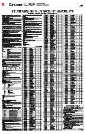 特别提示 永和流体智控股份有限公司(以下简称“永和智控”或“发行人”)根据《证券发行与承销管理办法》(证监会令[第121号])、《首次公开发行股票并上市管理办法》(证监会令[第122号])、《首次公开发行股票承销业务规范》(中证协发[2016]7号)、《首次公开发行股票配售细则》(中证协发[2016]7号)和《首次公开发行股票网下投资者管理细则》(中证协发[2016]7号)等相关规定组织实施首次公开发行。 本次发行初步询价和网下发行均通过深圳证券交易所(以下简称“深交所”)网下发行电子平台及中国证券登记结算有限责任公司深圳分公司(以下简称“中国结算深圳分公司”)登记结算平台进行,请网下投资者认真阅读本公告及深交所公布的《深圳市场首次公开发行股票网下发行实施细则(2016年1月修订)》(深证上[2016]3号)。 本次网上发行通过深交所交易系统进行,请网上投资者认真阅读本公告及深交所公布的《深圳市场首次公开发行股票网上发行实施细则(2016年1月修订)》(深证上[2016]3号)(以下简称“《网上发行实施细则》”)。 本次发行在发行流程、网上网下申购及缴款等环节有重大变化,敬请投资者重点关注,主要变化如下: 1、发行人和主承销商中信建投证券股份有限公司(以下简称“中信建投证券”、“主承销商”)根据初步询价结果,综合考虑发行人基本面、市场情况、同行业上市公司估值水平、募集资金需求及承销风险等因素,协商确定本次发行价格为14.85元/股。 投资者请按14.85元/股在2016年4月19日(T日)进行网上和网下申购,申购时无需缴付申购资金。本次网下发行申购日与网上申购日同为2016年4月19日(T日),其中,网下申购时间为9:30-15:00,网上申购时间为9:15-11:30,13:00-15:00。 2、网下投资者报价后,发行人和主承销商将剔除拟申购总量中报价最高的部分,剔除部分不低于网下投资者拟申购总量的10%(最高申报价格与确定的发行价格相同时,对该价格的申报不再剔除,剔除比例低于10%)。 3、网上投资者应当自主表达申购意向,不得全权委托证券公司进行新股申购。 4、网下投资者应根据《网下发行初步配售结果公告》,于2016年4月21日(T+2日)16:00前,按最终确定的发行价格与获配数量,及时足额缴纳新股认购资金。 网上投资者申购新股中签后,应根据《网上中签结果公告》履行缴款义务,确保其资金账户在2016年4月21日(T+2日)日终有足额的新股认购资金,投资者款项划付需遵守投资者所在证券公司的相关规定。 网下和网上投资者放弃认购部分的股份由主承销商包销。 5、当出现网下和网上投资者缴款认购的股份数量合计不足本次公开发行数量的70%时,主承销商将中止本次新股发行,并就中止发行的原因和后续安排进行信息披露。 6、有效报价网下投资者未参与申购或者获得初步配售的网下投资者未及时足额缴纳认购款的,将被视为违约并应承担违约责任,主承销商将违约情况报中国证券业协会备案。网上投资者连续12个月内累计出现3次中签后未足额缴款的情形时,6个月内不得参与新股申购。 发行人与主承销商郑重提示广大投资者注意投资风险,理性投资,认真阅读本公告及同日刊登于《中国证券报》、《证券时报》、《上海证券报》、《证券日报》及巨潮资讯网(www.cninfo.com.cn)的《永和流体智控股份有限公司首次公开发行股票投资风险特别公告》。 估值及投资风险提示 1、按照中国证监会制定的《上市公司行业分类指引》,发行人所属行业为通用设备制造业(C34),中证指数有限公司已经发布的行业最近一个月静态平均市盈率为54.49倍(截至2016年4月14日),请投资者决策时参考。本次发行价格14.85元/股对应的2015年扣除非常性损益前后孰低的净利润摊薄后市盈率为22.99倍,低于中证指数公司2016年4月14日发布的行业最近一个月静态平均市盈率。 新股投资具有较大的市场风险,投资者需要充分了解证券市场的风险,仔细研读发行人招股说明书中披露的风险,并充分考虑风险因素,审慎参与本次新股发行。 2、根据初步询价结果,经发行人和主承销商协商确定,本次公开发行新股2,500万股,本次发行不设老股转让。发行人本次发行的募投项目计划所需资金额为32,821.27万元。按本次发行价格14.85元/股,发行人预计募集资金37,125万元,扣除发行费用4,303.73万元后,预计募集资金净额为32,821.27万元。 3、发行人本次募集资金如果运用不当或短期内业务不能同步增长,将对发行人的盈利水平造成不利影响或存在发行人净资产收益率出现较大幅度下降的风险,由此造成发行人估值水平下调、股价下跌,从而给投资者带来投资损失的风险。 重要提示 1、永和流体智控股份有限公司首次公开发行不超过2,500万股人民币普通股(A股)(以下简称“本次发行”)的申请已获中国证券监督管理委员会证监许可[2016]540号文核准。 2、本次发行采用网下向符合条件的投资者询价配售(以下简称“网下发行”)和网上向持有深圳市场非限售A股股份市值的公众投资者定价发行(以下简称“网上发行”)相结合的方式,由中信建投证券分别通过深交所网下发行电子平台和深交所交易系统实施,并拟在深交所中小板上市。本次发行股票申购简称为“永和智控”,申购代码为“002795”,该申购简称及申购代码同时用于本次发行网下网上申购。 3、本次共公开发行2,500万股A股。回拨机制启动前,网下初始发行数量1