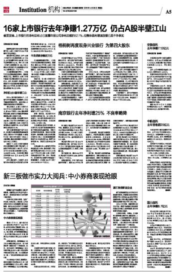 16家上市银行去年净赚1.27万亿 仍占A股半壁江山截至发稿,上市银行的净利总和占已披露年报公司净利总额的52.1%,但整体盈利增速放缓已是不争事实 2016-04-28 来源:证券时报网 作者:曾炎鑫